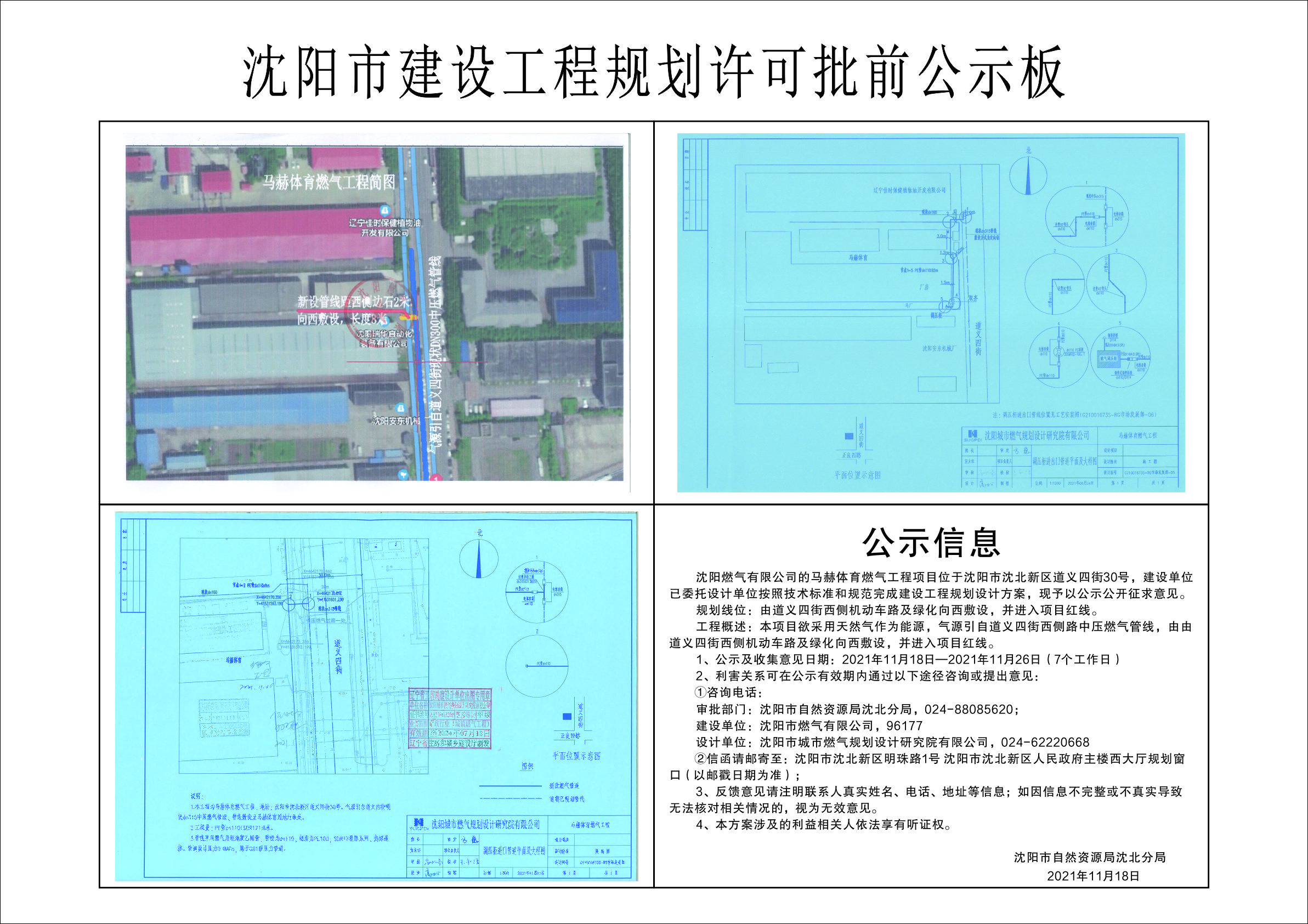 沈阳燃气有限公司的马赫体育燃气工程项目位于沈阳市沈北新区道义四街30号,建设单位已委托设计单位按照技术标准和规范完成建设工程规划设计方案,现予以公示公开征求意见。 规划线位:由道义四街西侧机动车路及绿化向西敷设,并进入项目红线。 工程概述:本项目欲采用天然气作为能源,气源引自道义四街西侧路中压燃气管线,由由道义四街西侧机动车路及绿化向西敷设,并进入项目红线。 1、公示及收集意见日期:2021年11月18日—2021年11月26日(7个工作日) 2、利害关系可在公示有效期内通过以下途径咨询或提出意见: ①咨询电话: 审批部门:沈阳市自然资源局沈北分局,024-88085620; 建设单位:沈阳市燃气有限公司,96177 设计单位:沈阳市城市燃气规划设计研究院有限公司,024-62220668 ②信函请邮寄至:沈阳市沈北新区明珠路1号 沈阳市沈北新区人民政府主楼西大厅规划窗口(以邮戳日期为准); 3、反馈意见请注明联系人真实姓名、电话、地址等信息;如因信息不完整或不真实导致无法核对相关情况的,视为无效意见。 4、本方案涉及的利益相关人依法享有听证权。 沈阳市自然资源局沈北分局 2021年11月18日