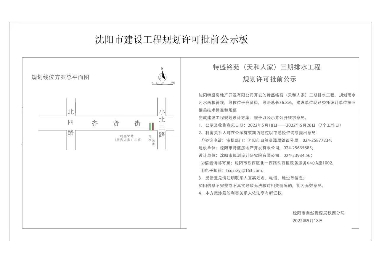 特盛铭苑(天和人家)三期排水工程规划许可批前公示 沈阳特盛房产开发有限公司开发的特盛铭苑(天和人家)三期排水工程,规划雨水污水两根管线,线位位于齐贤街。线路总长36.8米,建设单位现已委托设计单位按照相关技木标准和规范完成建设工程规划设计方案,现予以公示井公开征求意见。 1.公示及收集意见日期:2022年5月18日——2022年5月26日(7个工作日) 2.利害关系人可在公示有效期内通过以下途径咨询或提出意见∶ ①咨询电话∶审批部门:沈阳市自然资源局铁西分局,024-25877234; 建设单位∶沈阳市特盛房地产开发有限公司,024-25635885; 设计单位∶沈阳市规划设计研究院有限公司,024-2393456; ②信函请邮寄至:沈阳市铁西区北一西路铁西区政务服务中心A座1002。 ③电子邮箱:txqzrzyj@163.com。 3、反馈意见请注明联系人真实姓名、电话、地址等信息;如因信息不完整或不真实导致无法核对相关情况的,视为无效意见。 4、本方案涉及的利害关系人依法享有听证权。