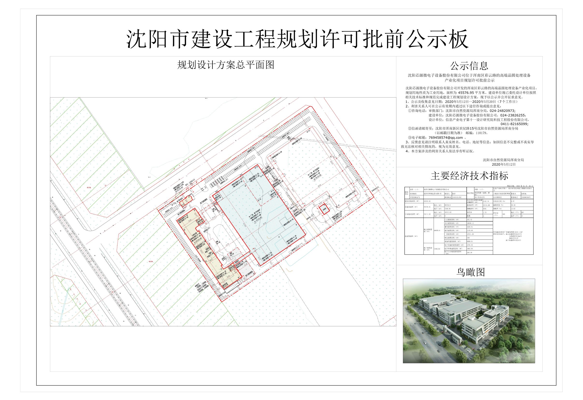 沈阳芯源微电子设备股份有限公司建设的浑南区彩云路的高端晶圆处理设备产业化项目,规划用地性质为工业用地,面积为45576.95平方米。建设单位现已委托设计单位按照相关技术标准和规范完成建设工程规划设计方案,现予以公示并公开征求意见。 1、公示及收集意见日期:2020年5月12日——2020年5月20日(7个工作日) 2、利害关系人可在公示有效期内通过以下途径咨询或提出意见: ①咨询电话: 审批部门:沈阳市自然资源局浑南分局,024-24820973; 建设单位:沈阳芯源微电子设备股份有限公司,024-23826255; 设计单位:信息产业电子第十一设计研究院科技工程股份有限公司,0411-82165099; ②信函请邮寄至;沈阳市浑南新区世纪路15号沈阳市自然资源局浑南分局(以邮戳日期为准) 邮编:110179。 ③电子邮箱:769458574@qq.com。 3、反馈意见请注明联系人真实姓名、电话、地址等信息;如因信息不完整或不真实导致无法核对相关情况的,视为无效意见。 4、本方案涉及的利害关系人依法享有听证权。