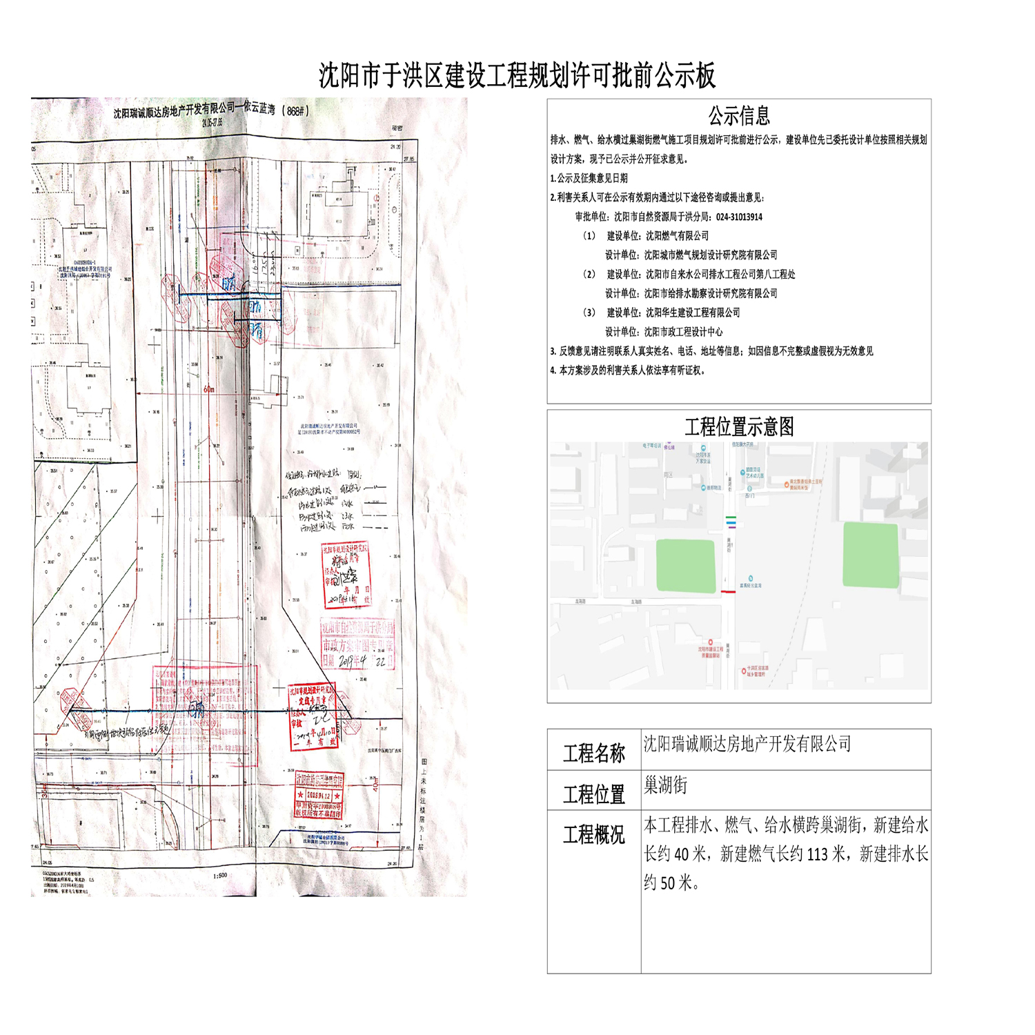 燃气、给水、排水《建设工程规划许可证(市政)》批前公示 经沈阳市自然资源局于洪分局规划科审核,拟批准燃气、给水、排水规划方案,现对该项目总平面规划方案进行公示并征求意见。 1.公示及收集意见日期:2019年5月21日——2019年5月29日(7个工作日) 2.利害关系人可在公示有效期内通过以下途径咨询或提出意见: 咨询电话:审批部门:沈阳市自然资源局于洪分局 规划科,024-31013914 (1)建设单位:沈阳燃气有限公司 设计单位:沈阳城市燃气规划设计研究院有限公司 (2)建设单位:沈阳市自来水公司排水工程公司第八工程处 设计单位:沈阳市给排水勘察设计研究院有限公司 (3)建设单位:沈阳华生建设工程有限公司 设计单位:沈阳市政工程设计中心 ②信函请邮寄至;沈阳市于洪区沈大路63号。 ③电子邮箱:404851790@qq.com。 3.反馈意见请注明联系人真实姓名、电话、地址等信息;如因信息不完整或不真实导致无法核对相关情况的,视为无效意见。 4.本方案涉及的利害关系人依法享有听证权。