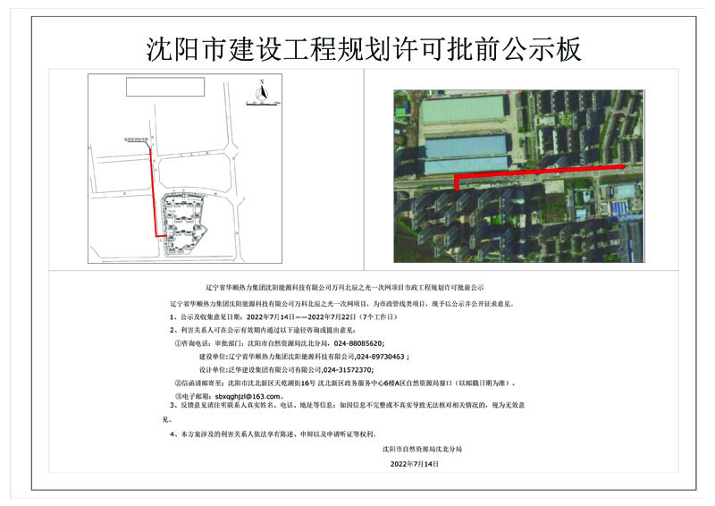 辽宁省华顺热力集团沈阳能源科技有限公司位于道义四街供热联网工程 规划许可批前公示