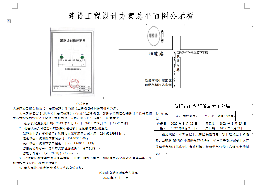 公示信息 大东区凌云街-1地块(中海汇德理)住宅燃气工程项目规划许可批前公示 大东区凌云街-1地块(中海汇德理)住宅燃气工程项目,建设单位现已委托设计单位按照相关技术标准和规范完成建设工程规划设计方案,现予以公示并公开征求意见。 1、公示及收集意见日期:2022年8月15日—2022年8月23日(7个工作日) 2、利害关系人可在公示有效期内通过以下途径咨询或提出意见: ①咨询电话:审批部门:沈阳市自然资源局大东分局,024-62199948; 建设单位:沈阳燃气有限公司,15940325588; 设计单位:沈阳市政工程设计中心,13604011129; ②信函请邮寄至:沈阳市大东区滂江街73号审批科。 ③电子邮箱:ddghj_2008@126.com。 3、反馈意见请注明联系人真实姓名、电话、地址等信息;如因信息不完整或不真实导致无法核对相关情况的,视为无效意见。 4、本方案涉及的利害关系人依法享有听证权。 沈阳市自然资源局大东分局 2022年8月15日