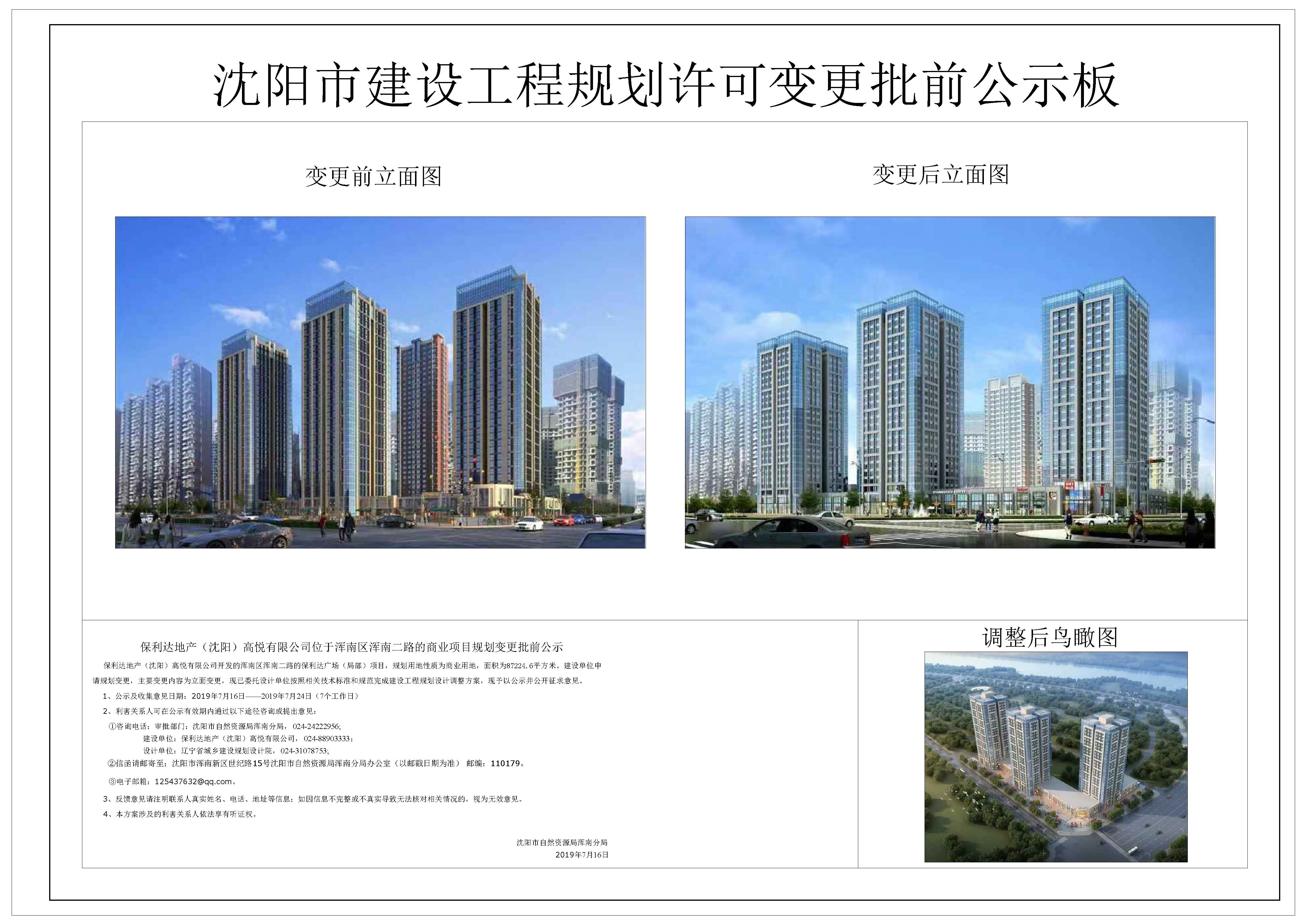 保利达地产(沈阳)高悦有限公司开发的浑南区浑南二路的保利达广场(局部)项目,规划用地性质为商业用地,面积为87224.6平方米。建设单位申请规划变更,主要变更内容为立面变更,现已委托设计单位按照相关技术标准和规范完成建设工程规划设计调整方案,现予以公示并公开征求意见。 1、公示及收集意见日期:2019年7月16日——2019年7月24日(7个工作日) 2、利害关系人可在公示有效期内通过以下途径咨询或提出意见: ①咨询电话:审批部门:沈阳市自然资源局浑南分局,024-24222956; 建设单位:保利达地产(沈阳)高悦有限公司,024-88903333; 设计单位:辽宁省城乡建设规划设计院,024-31078753; ②信函请邮寄至;沈阳市浑南新区世纪路15号沈阳市自然资源局浑南分局(以邮戳日期为准) 邮编:110179。 ③电子邮箱:125437632@qq.com。 3、反馈意见请注明联系人真实姓名、电话、地址等信息;如因信息不完整或不真实导致无法核对相关情况的,视为无效意见。 4、本方案涉及的利害关系人依法享有听证权。
