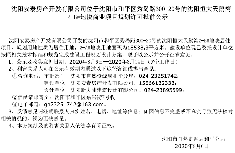 沈阳安泰房产开发有限公司位于沈阳市和平区秀岛路300-20号的沈阳恒大天鹅湾2-B#地块商业项目规划许可批前公示