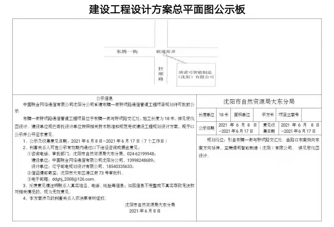 中国联合网络通信有限公司沈阳分公司位于东腾一街的通信管道项目规划许可批前公示