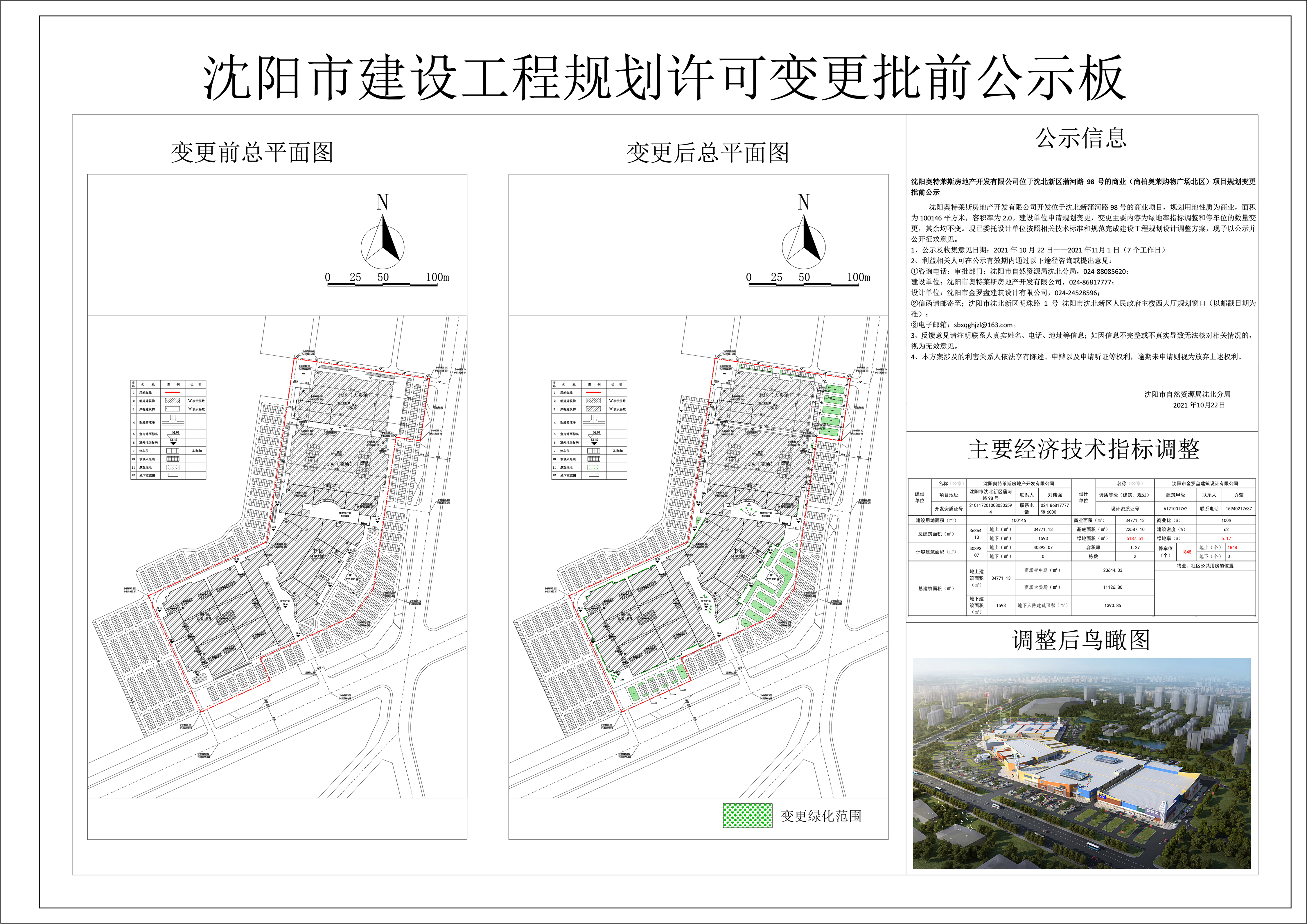 沈阳奥特莱斯房地产开发有限公司位于沈北新区蒲河路98号的 商业(尚柏奥莱购物广场北区)项目规划变更批前公示 沈阳奥特莱斯房地产开发有限公司开发位于沈北新蒲河路98号的商业项目,规划用地性质为商业,面积为100146平方米,容积率为2.0。建设单位申请规划变更,变更主要内容为绿地率指标调整和停车位的数量变更,其余均不变。现已委托设计单位按照相关技术标准和规范完成建设工程规划设计调整方案,现予以公示并公开征求意见。 1、公示及收集意见日期:2021年10月22日——2021年11月1日(7个工作日) 2、利益相关人可在公示有效期内通过以下途径咨询或提出意见: ①咨询电话:审批部门:沈阳市自然资源局沈北分局,024-88085620; 建设单位:沈阳市奥特莱斯房地产开发有限公司,024-86817777; 设计单位:沈阳市金罗盘建筑设计有限公司,024-24528596; ②信函请邮寄至;沈阳市沈北新区明珠路1号 沈阳市沈北新区人民政府主楼西大厅规划窗口(以邮戳日期为准); ③电子邮箱:sbxqghjzl@163.com。 3、反馈意见请注明联系人真实姓名、电话、地址等信息;如因信息不完整或不真实导致无法核对相关情况的,视为无效意见。 4、本方案涉及的利害关系人依法享有陈述、申辩以及申请听证等权利,逾期未申请则视为放弃上述权利。 沈阳市自然资源局沈北分局 2021年10月22日