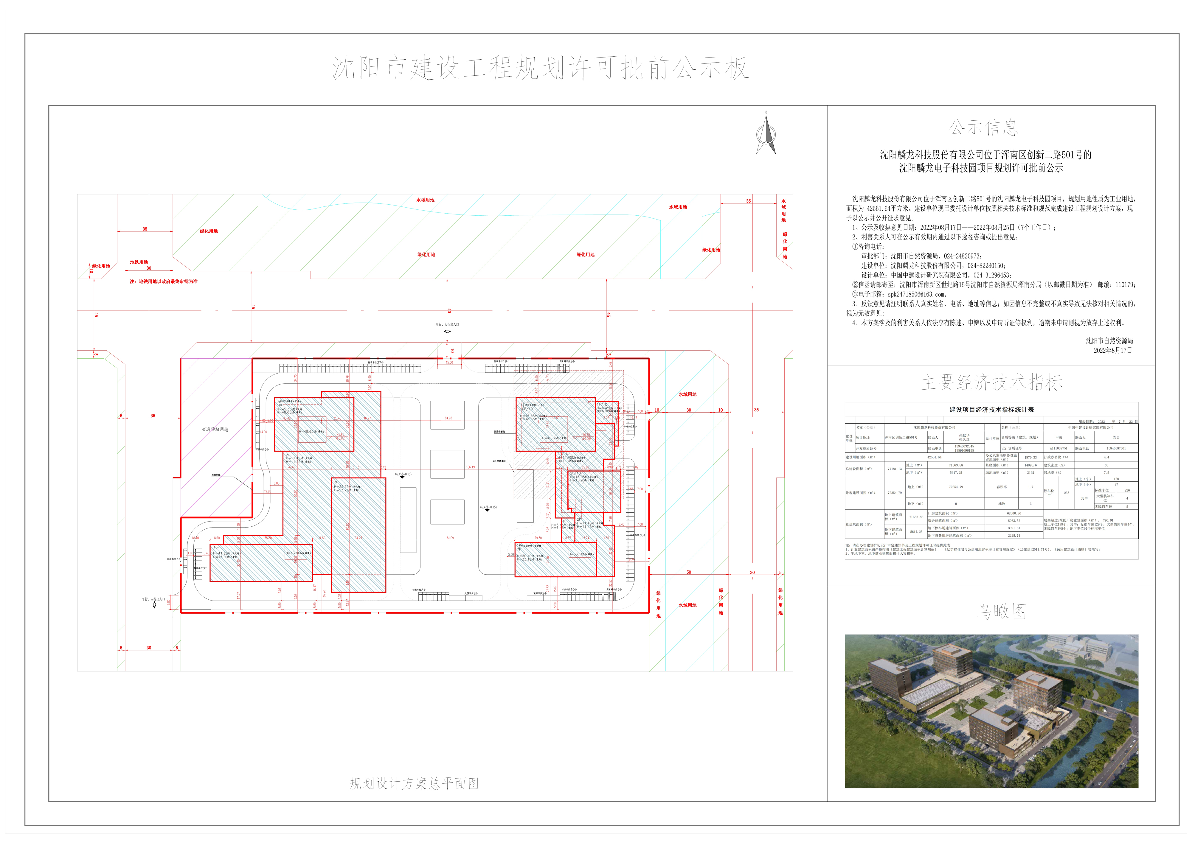 沈阳麟龙科技股份有限公司位于浑南区创新二路501号的沈阳麟龙电子科技园项目,规划用地性质为工业用地,面积为 42561.64平方米。建设单位现已委托设计单位按照相关技术标准和规范完成建设工程规划设计方案,现予以公示并公开征求意见。 1、公示及收集意见日期:2022年08月17日——2022年08月25日(7个工作日); 2、利害关系人可在公示有效期内通过以下途径咨询或提出意见: ①咨询电话: 审批部门:沈阳市自然资源局,024-24820973; 建设单位:沈阳麟龙科技股份有限公司,024-82280150; 设计单位:中国中建设计研究院有限公司,024-31296453; ②信函请邮寄至;沈阳市浑南新区世纪路15号沈阳市自然资源局浑南分局(以邮戳日期为准) 邮编:110179; ③电子邮箱:spk24718506@163.com。 3、反馈意见请注明联系人真实姓名、电话、地址等信息;如因信息不完整或不真实导致无法核对相关情况的,视为无效意见; 4、本方案涉及的利害关系人依法享有陈述、申辩以及申请听证等权利,逾期未申请则视为放弃上述权利。