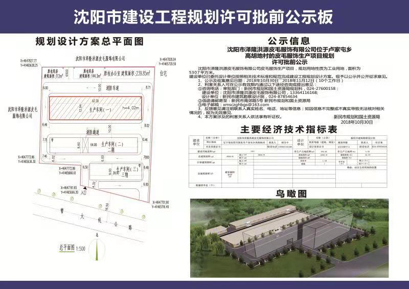 沈阳市泽隆洪源皮毛服饰有限公司位于卢家屯乡高胡地村的皮毛服饰生产项目规划许可批前公示