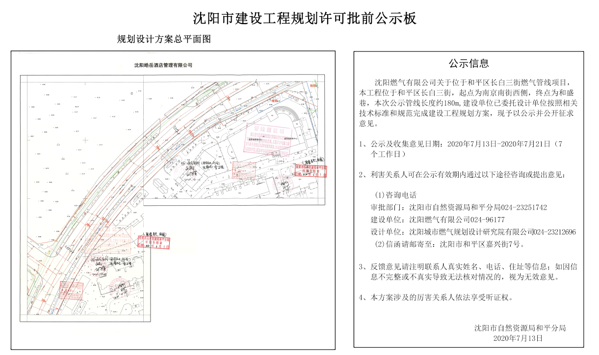 沈阳燃气有限公司和平区长白三街燃气管线项目市政工程规划许可证批前公示
