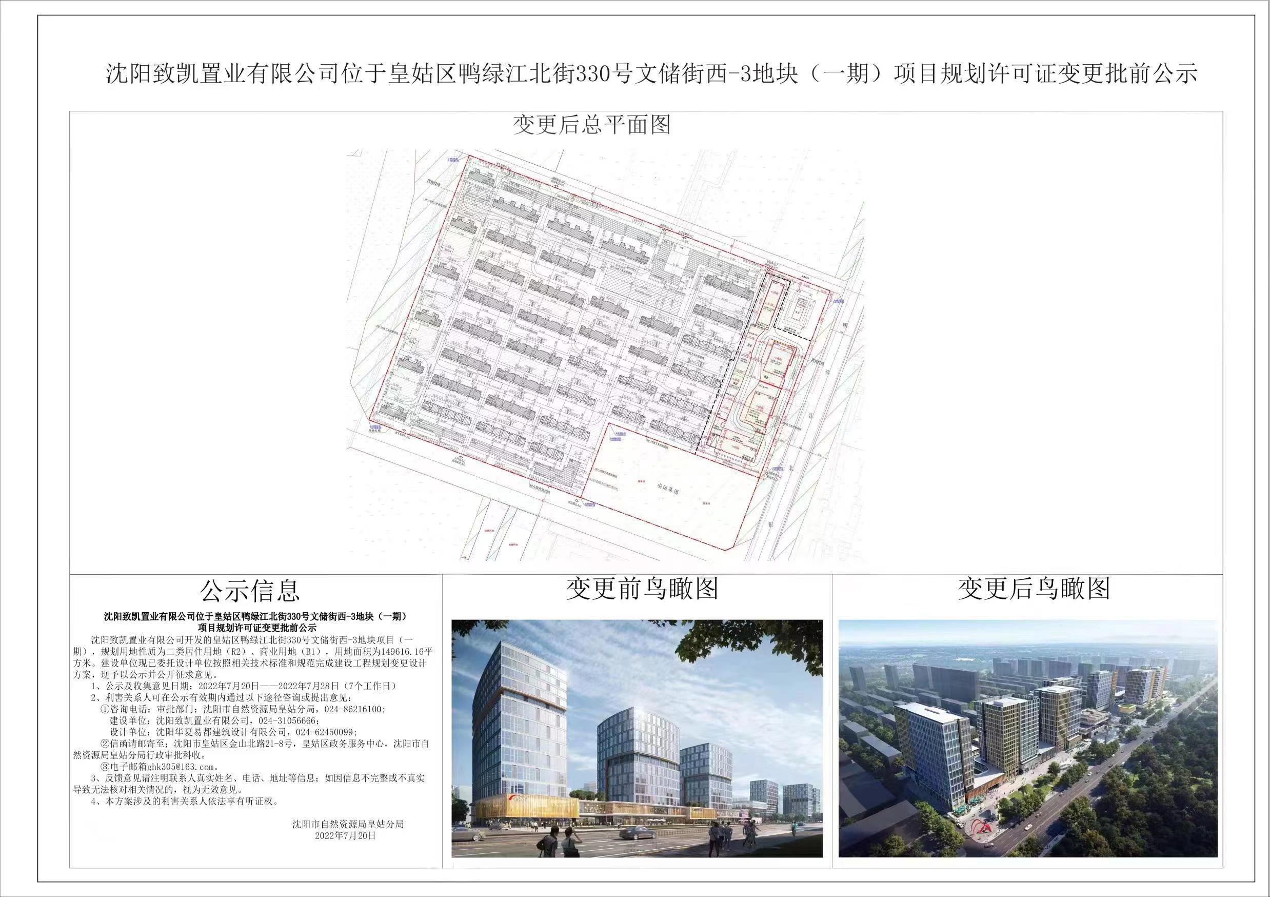 沈阳致凯置业有限公司开发的皇姑区鸭绿江北街330号文储街西-3地块项目(一期),规划用地性质为二类居住用地(R2)、商业用地(B1),用地面积为149616.16平方米。建设单位现已委托设计单位按照相关技术标准和规范完成建设工程规划变更设计方案,现予以公示并公开征求意见。 1、公示及收集意见日期:2022年7月20日——2022年7月28日(7个工作日) 2、利害关系人可在公示有效期内通过以下途径咨询或提出意见: ①咨询电话:审批部门:沈阳市自然资源局皇姑分局,024-86216100; 建设单位:沈阳致凯置业有限公司,024-31056666; 设计单位:沈阳华夏易都建筑设计有限公司,024-62450099; ②信函请邮寄至;沈阳市皇姑区金山北路21-8号,皇姑区政务服务中心,沈阳市自然资源局皇姑分局行政审批科收。 ③电子邮箱ghk305@163.com。 3、反馈意见请注明联系人真实姓名、电话、地址等信息;如因信息不完整或不真实导致无法核对相关情况的,视为无效意见。 4、本方案涉及的利害关系人依法享有听证权。
