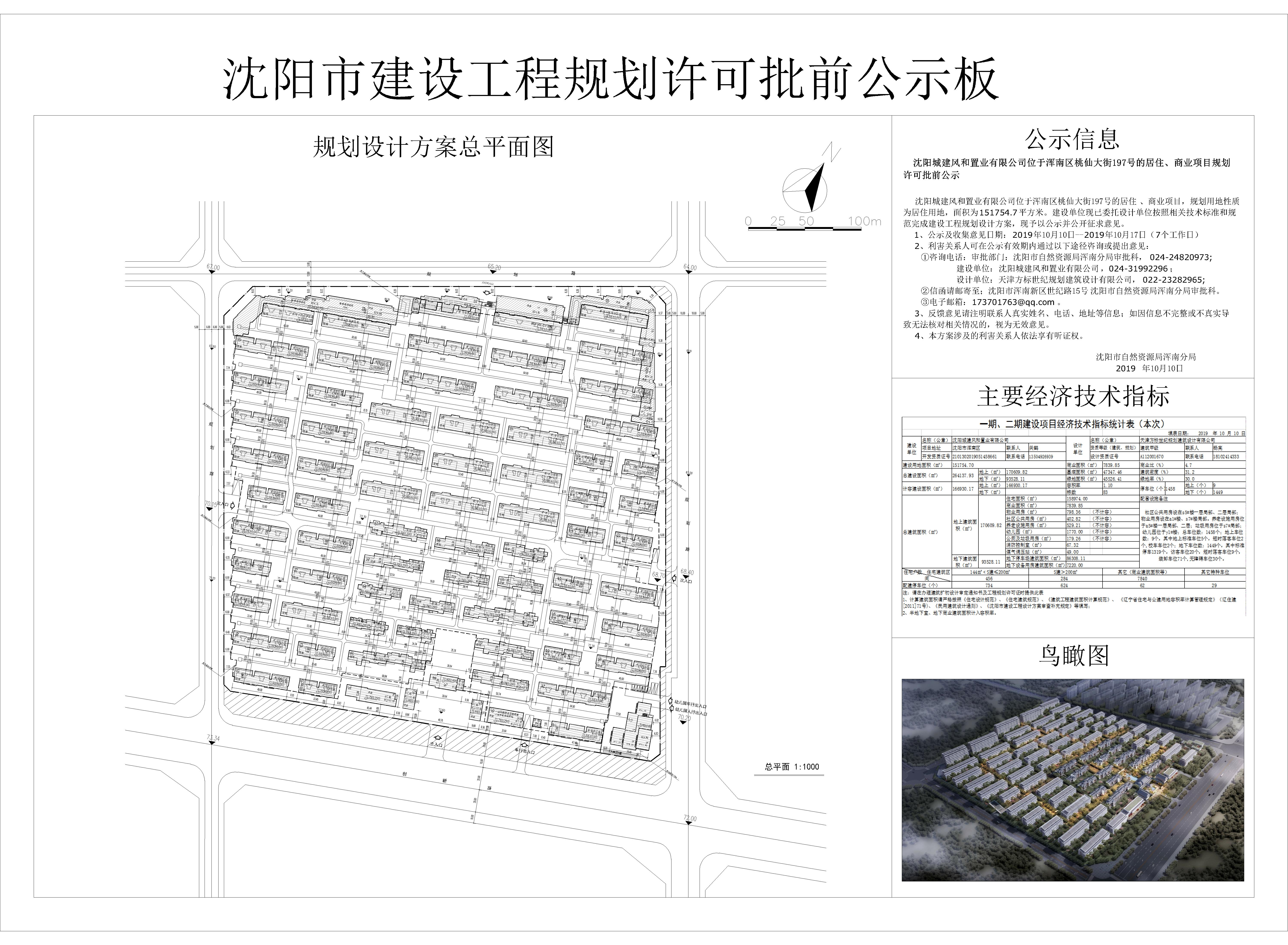 沈阳城建风和置业有限公司位于浑南区桃仙大街197号的居住、商业项目,规划用地性质为居住用地,面积为151754.7平方米。建设单位现已委托设计单位按照相关技术标准和规范完成建设工程规划设计方案,现予以公示并公开征求意见。 1、公示及收集意见日期:2019年10月10日--2019年10月17日(7个工作日) 2、利害关系人可在公示有效期内通过以下途径咨询或提出意见: ①咨询电话:审批部门:沈阳市自然资源局浑南分局审批科,024-24820973; 建设单位:沈阳城建风和置业有限公司,024-31992296; 设计单位:天津方标世纪规划建筑设计有限公司,022-23282965; ②信函请邮寄至;沈阳市浑南新区世纪路15号沈阳市自然资源局浑南分局审批科。 ③电子邮箱:173701763@qq.com。 3、反馈意见请注明联系人真实姓名、电话、地址等信息;如因信息不完整或不真实导致无法核对相关情况的,视为无效意见。 4、本方案涉及的利害关系人依法享有听证权。