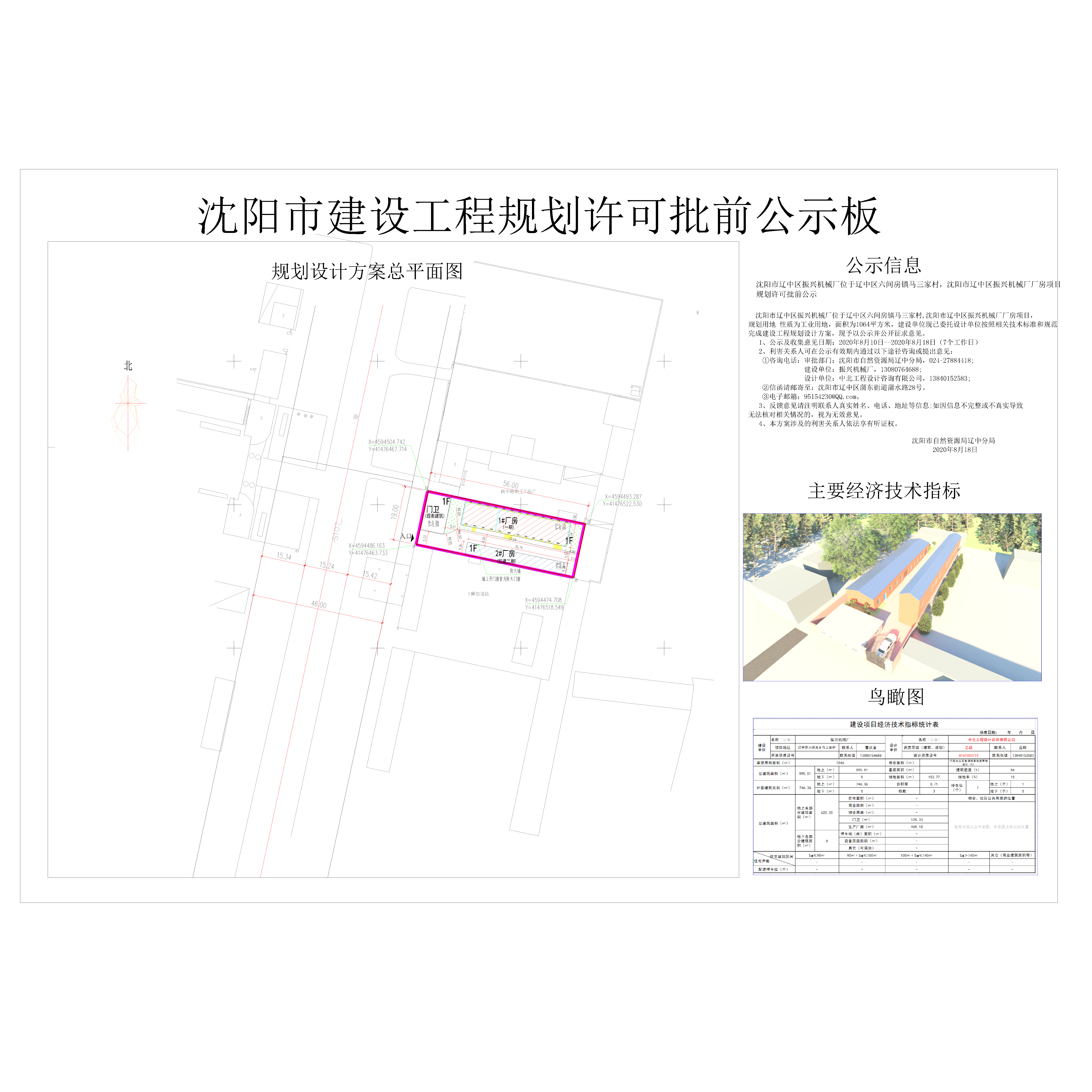 沈阳市辽中区振兴机械厂厂房项目,规划用地性质为工业用地,面积为1064平方米,建设单位现已委托设计单位按照相关技术标准和规范完成建设工程规划设计方案,现予以公示并公开征求意见。 1、公示及收集意见日期:2020年08月10日--2020年08月18日(7个工作日) 2、利害关系人可在公示有效期内通过以下途径咨询或提出意见: ①咨询电话:审批部门:沈阳市自然资源局辽中分局,024-27884418; 建设单位:沈阳市辽中区振兴机械厂,13080764688 设计单位:沈阳市金罗盘建筑设计有限公司,024-62915999; ②信函请邮寄至:沈阳市辽中区蒲东街道蒲水路28号 ③电子邮箱:95154230@QQ.com。 3、反馈意见请注明联系人真实姓名、电话、地址等信息;如因信息不完整或不真实导致 无法核对相关情况的,视为无效意见。 4、本方案涉及的利害关系人依法享有听证权。