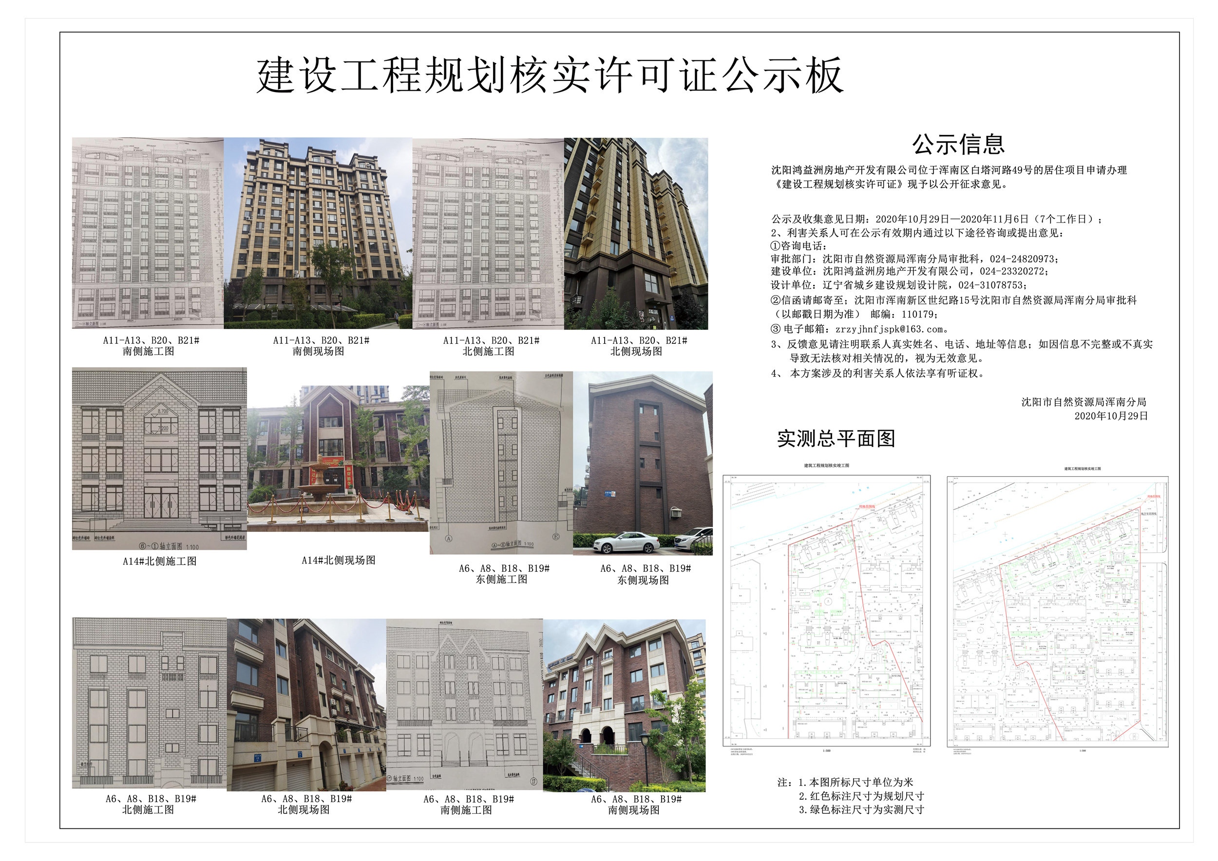 公示信息 沈阳鸿益洲房地产开发有限公司位于浑南区白塔河路49号的居住项目申请办理《建设工程规划核实许可证》现予以公开征求意见。