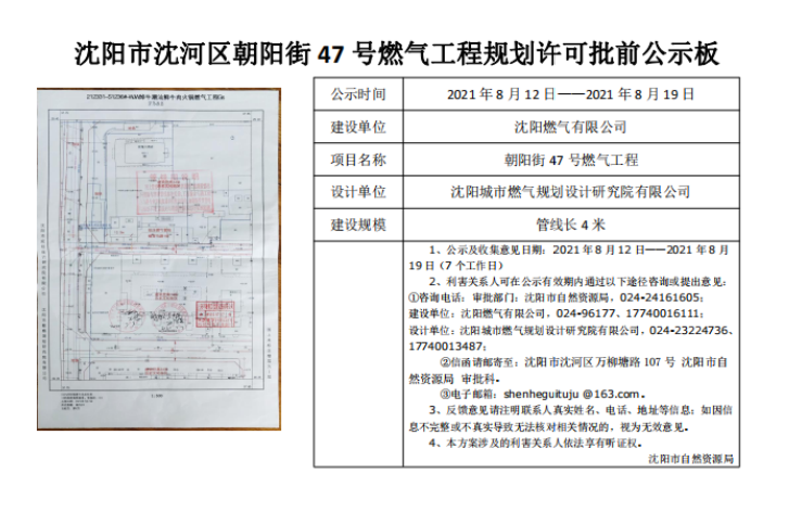沈阳燃气有限公司位于朝阳街47号燃气工程规划许可批前公示