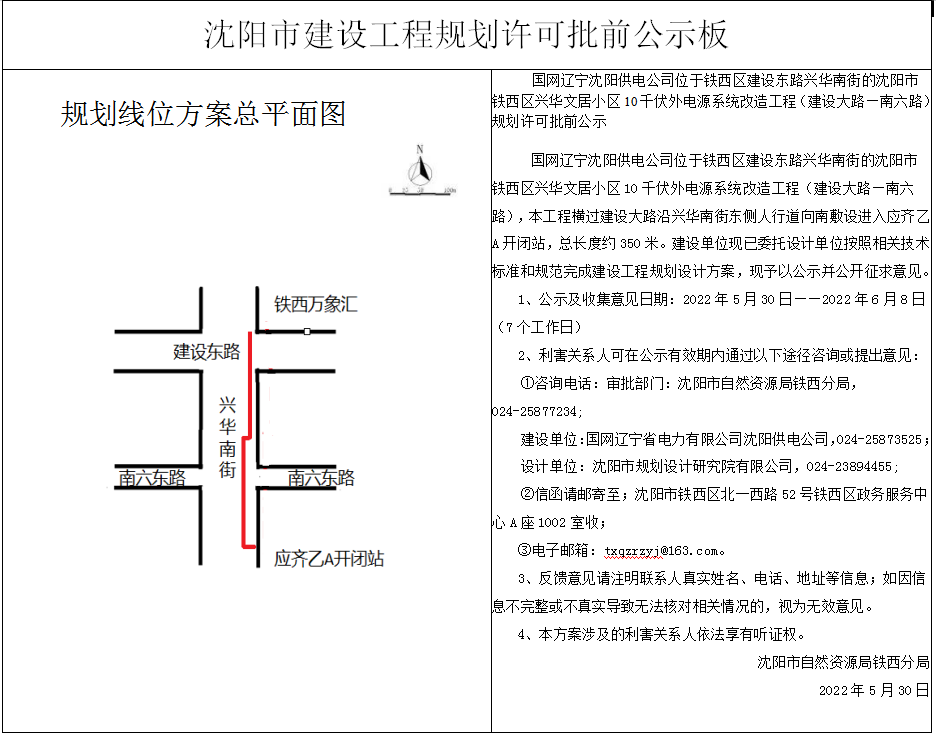 国网辽宁沈阳供电公司位于铁西区建设东路兴华南街的沈阳市铁西区兴华文居小区10千伏外电源系统改造工程(建设大路—南六路)规划许可批前公示 国网辽宁沈阳供电公司位于铁西区建设东路兴华南街的沈阳市铁西区兴华文居小区10千伏外电源系统改造工程(建设大路—南六路),本工程横过建设大路沿兴华南街东侧人行道向南敷设进入应齐乙A开闭站,总长度约350米。建设单位现已委托设计单位按照相关技术标准和规范完成建设工程规划设计方案,现予以公示并公开征求意见。 1、公示及收集意见日期:2022年5月30日——2022年6月8日(7个工作日) 2、利害关系人可在公示有效期内通过以下途径咨询或提出意见: ①咨询电话:审批部门:沈阳市自然资源局铁西分局,024-25877234; 建设单位:国网辽宁省电力有限公司沈阳供电公司,024-25873525; 设计单位:沈阳市规划设计研究院有限公司,024-23894455; ②信函请邮寄至;沈阳市铁西区北一西路52号铁西区政务服务中心A座1002室收; ③电子邮箱:txqzrzyj@163.com。 3、反馈意见请注明联系人真实姓名、电话、地址等信息;如因信息不完整或不真实导致无法核对相关情况的,视为无效意见。 4、本方案涉及的利害关系人依法享有听证权。 沈阳市自然资源局铁西分局 2022年5月30日