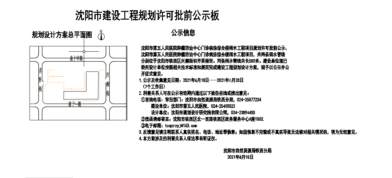 沈阳市第五人民医院肿瘤防治中心门诊病房综合楼雨水工程项目规划许可批前公示 沈阳市第五人民医院肿瘤防治中心门诊病房综合楼雨水工程项目,共两条雨水管线分别位于沈阳市铁西区兴顺街和齐贤南街。两条雨水管线共长583米。建设单位现已委托设计单位按照相关技术标准和规范完成建设工程规划设计方案,现予以公示并公开征求意见。 1. 公示及收集意见日期:2021 年 6 月 18 日---2021 年 6 月 2 8 日(7 个工作日) 2. 利害关系人可在公示有效期内通过以下途径咨询或提出意见: ①咨询电话:审批部门:沈阳市自然资源局铁西分局,024-25877234 建设单位:沈阳市第五人民医院 ,024-25405032 设计单位:沈阳市规划设计研究院有限公司,024-23894455 ②信函请邮寄至:沈阳市铁西区北一西路铁西区政务服务中心A 座1002. ③电子邮箱:txqzrzyj@163.com 3. 反馈意见请注明联系人真实姓名、电话、地址等信息;如因信息不完整或不真实导致无法核对相关情况的,视为无效意见。 4. 本方案涉及的利害关系人依法享有听证权。
