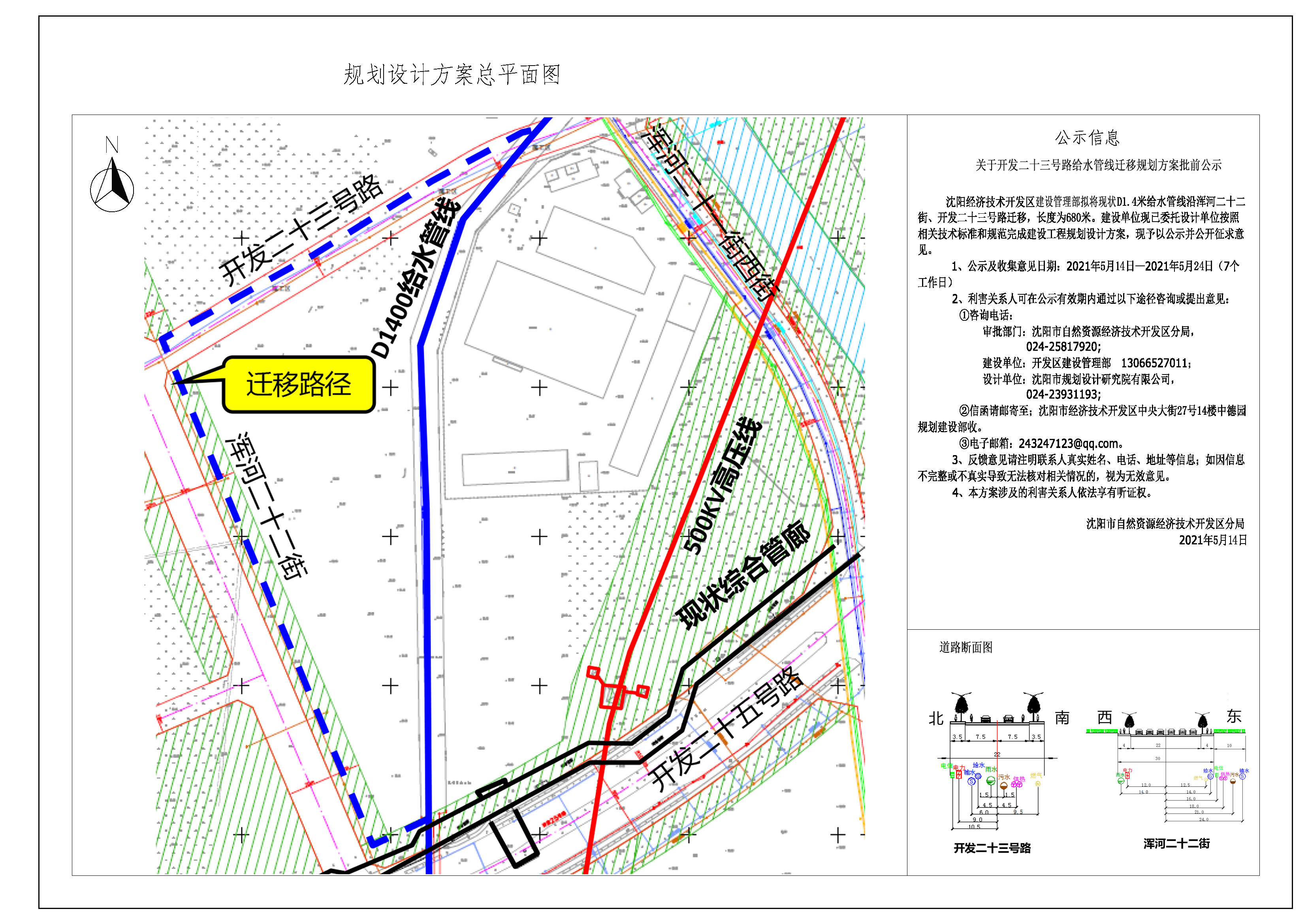 沈阳经济技术开发区建设管理部拟将现状D1.4米给水管线沿浑河二十二街、开发二十三号路迁移,长度为680米。建设单位现已委托设计单位按照相关技术标准和规范完成建设工程规划设计方案,现予以公示并公开征求意见。 1、公示及收集意见日期:2021年5月14日--2021年5月24日(7个工作日) 2、利害关系人可在公示有效期内通过以下途径咨询或提出意见: ①咨询电话: 审批部门:沈阳市自然资源经济技术开发区分局,024-25817920; 建设单位:开发区建设管理部 13066527011; 设计单位:沈阳市规划设计研究院有限公司,024-23931193; ②信函请邮寄至;沈阳市经济技术开发区中央大街27号14楼中德园规划建设部收。 ③电子邮箱:243247123@qq.com。 3、反馈意见请注明联系人真实姓名、电话、地址等信息;如因信息不完整或不真实导致无法核对相关情况的,视为无效意见。 4、本方案涉及的利害关系人依法享有听证权。