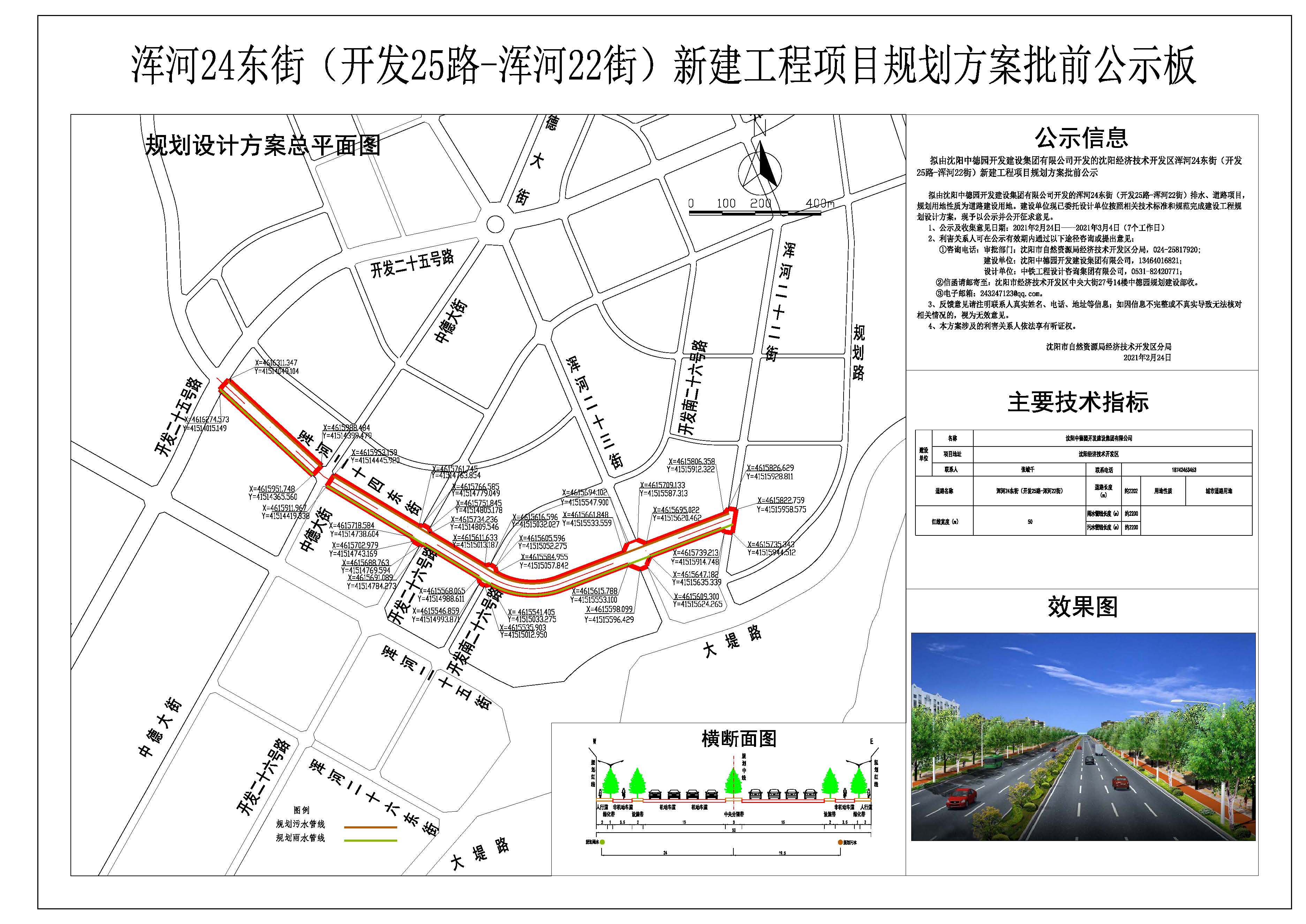 拟由沈阳中德园开发建设集团有限公司开发的沈阳经济技术开发区浑河24东街(开发25路-浑河22街)新建工程项目规划方案批前公示。 拟由沈阳中德园开发建设集团有限公司开发的浑河24东街(开发25路-浑河22街)排水、道路项目,规划用地性质为道路建设用地。建设单位现已委托设计单位按照相关技术标准和规范完成建设工程规划设计方案,现予以公示并公开征求意见。 1、公示及收集意见日期:2021年2月24日——2021年3月4日(7个工作日) 2、利害关系人可在公示有效期内通过以下途径咨询或提出意见: ①咨询电话:审批部门:沈阳市自然资源局经济技术开发区分局,024-25817920; 建设单位:沈阳中德园开发建设集团有限公司,13464016821; 设计单位:中铁工程设计咨询集团有限公司,0531-82420771; ②信函请邮寄至:沈阳市经济技术开发区中央大街27号14楼中德园规划建设部收。 ③电子邮箱:243247123@qq.com。 3、反馈意见请注明联系人真实姓名、电话、地址等信息;如因信息不完整或不真实导致无法核对相关情况的,视为无效意见。 4、本方案涉及的利害关系人依法享有听证权。