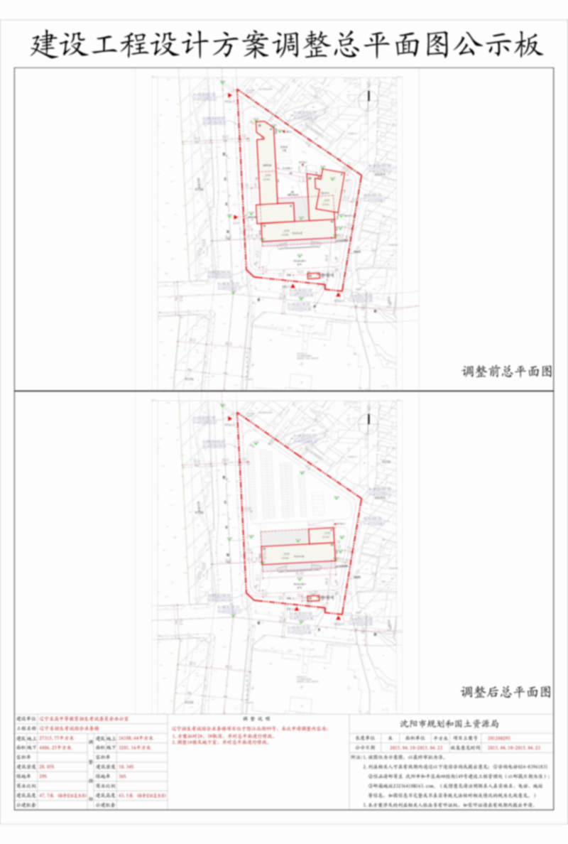 经沈阳市规划和国土资源局建设工程管理处审核,拟批准辽宁省高中等教育招生考试委员会办公室位于于洪区怒江北街99号的辽宁省招生考试综合业务楼项目规划调整方案,现对该项目总平面规划调整方案进行公示并征求意见。