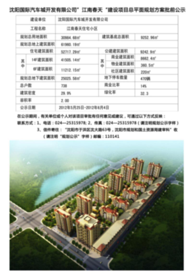 沈阳国际汽车城开发有限公司“江南春天”建设项目规划方案批前公示