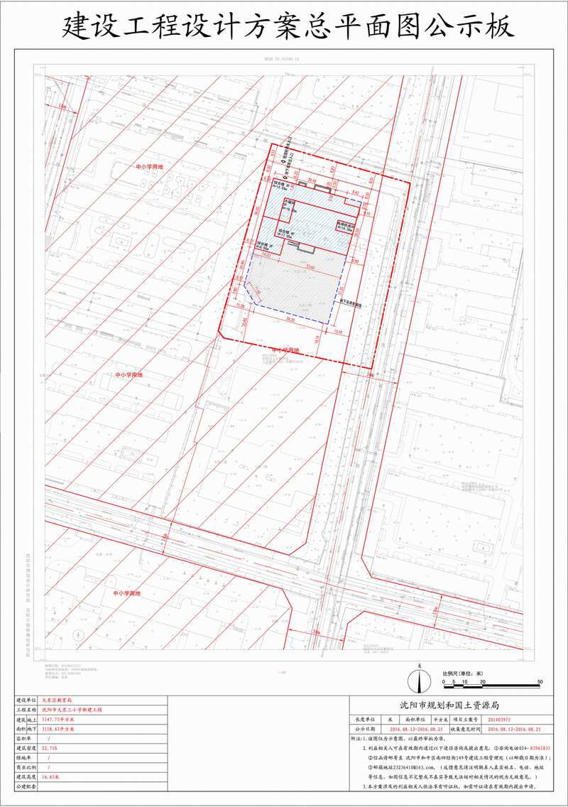 经沈阳市规划和国土资源局建设工程管理处审核,拟批准沈阳市大东区教育局位于大东区航空路24号规划方案,现对该项目总平面规划方案进行公示并征求意见。