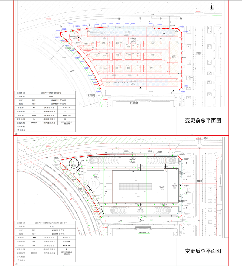 建设单位 沈阳中一集团医疗产业投资有限公司 工程名称 商业 建筑 面积 地上 198823平方米 地下 100377平方米 容积率 4.42 摘牌容积率 不大于4.5 建筑密度 60% 摘牌建筑密度 不大于65% 绿地率 10% 摘牌绿地率 不小于10% 商业比例 摘牌商业比例 建筑高度 98.95米 摘牌建筑高度 以净空审批部门 意见为准 公共配套(含物业) ![]() | |||||||||||||||||||||||||||||||||||||||||||||