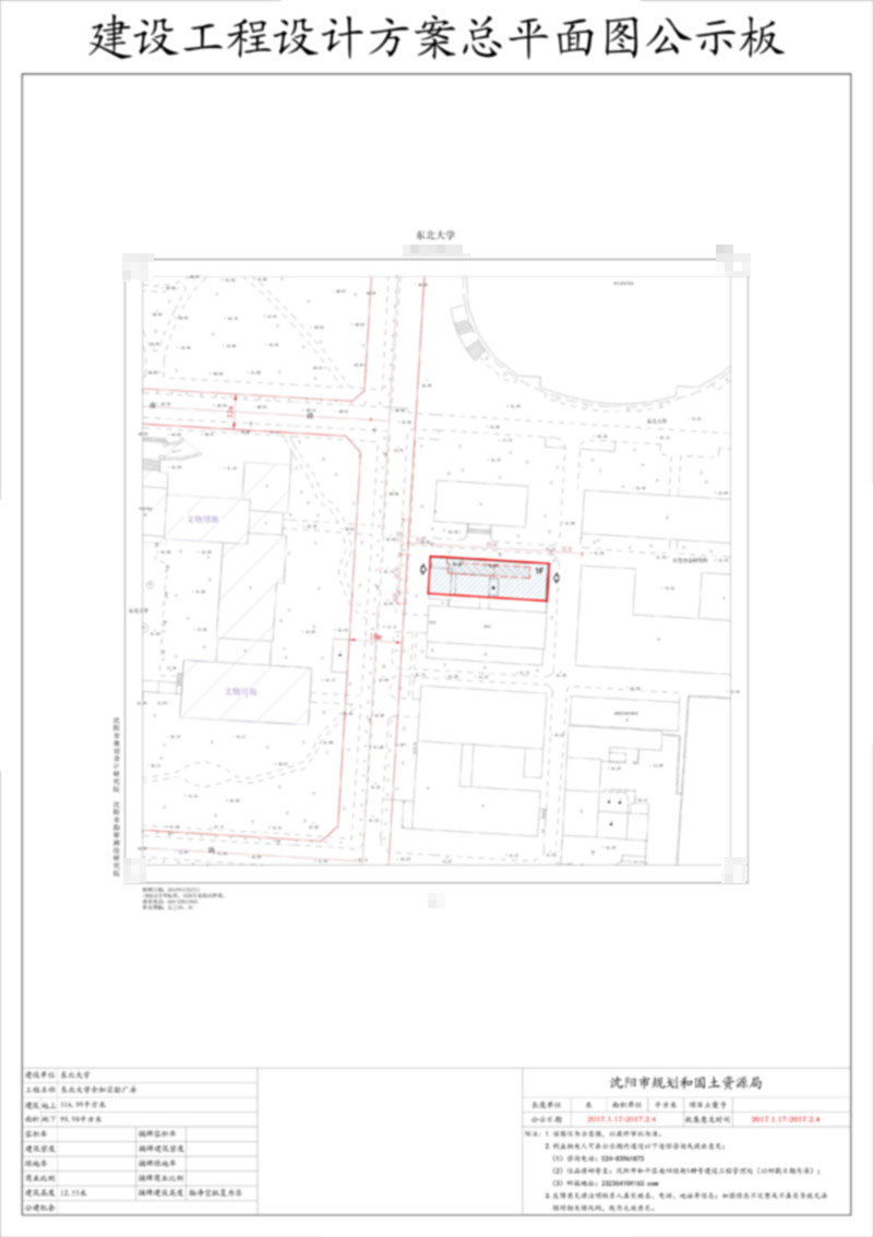 经沈阳市规划和国土资源局建设工程管理处审核,拟批准东北大学位于和平区文化路3号巷11号的高等教育建筑即金加实验厂房工程方案,现对该项目总平面方案进行公示并征求意见。