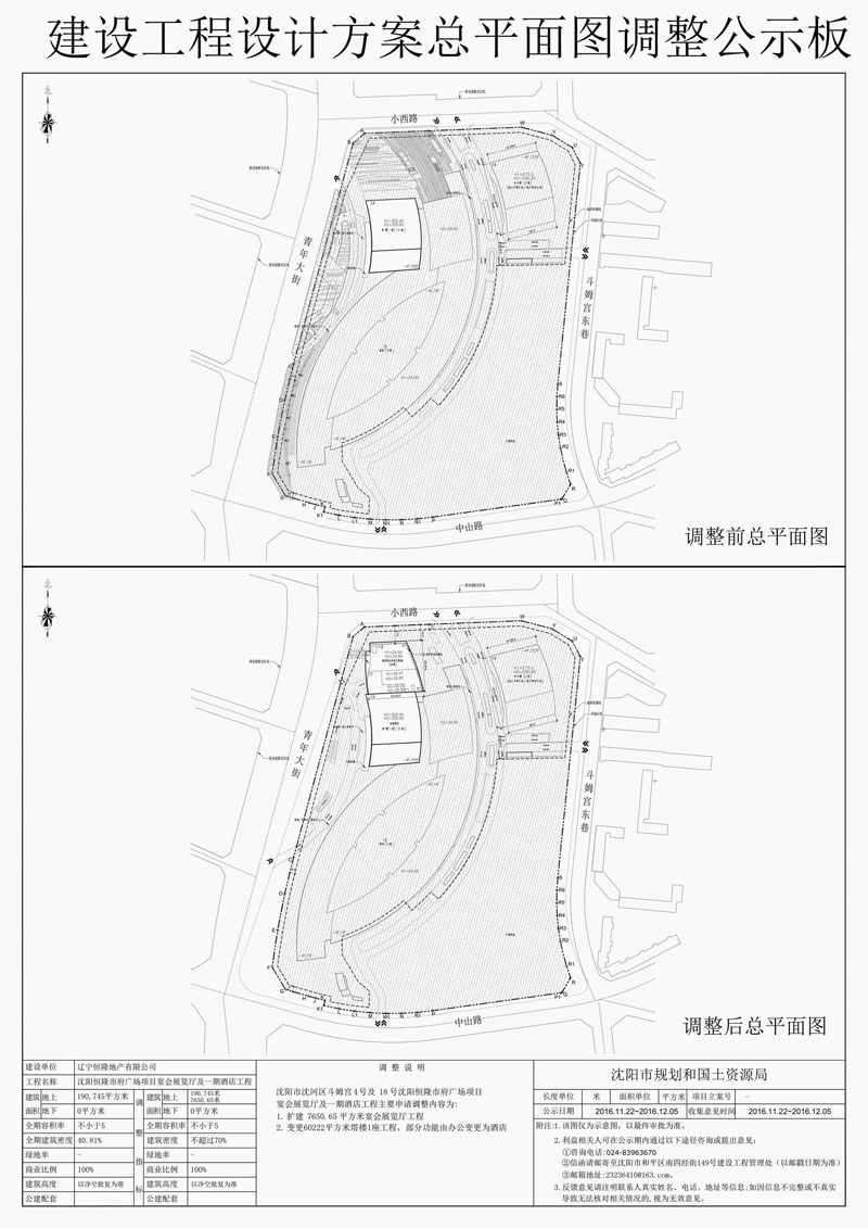 辽宁恒隆地产有限公司位于青年大街东侧的市府恒隆广场宴会展览厅及一期酒店工程规划方案调整批前公示