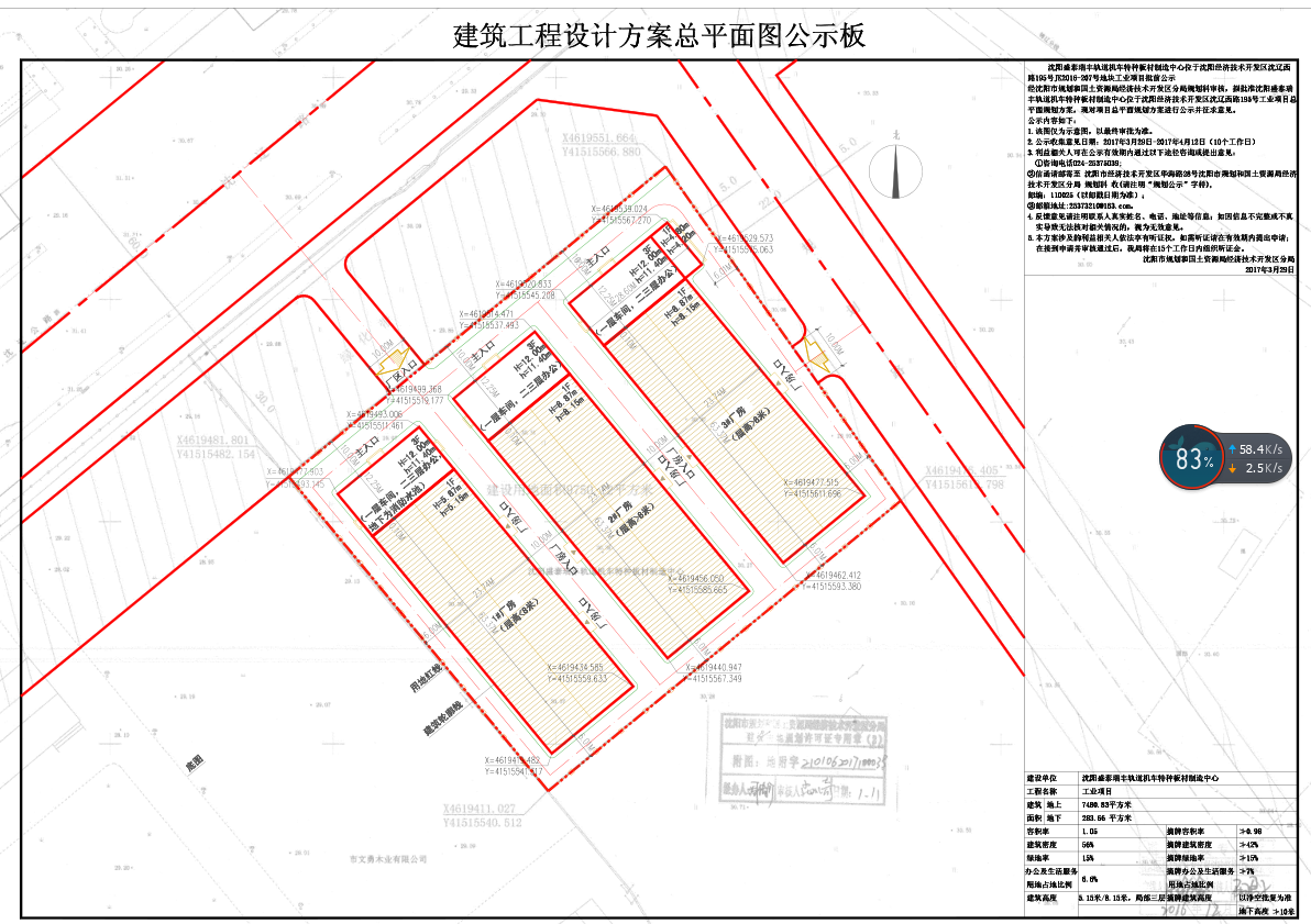 经沈阳市规划和国土资源局经济技术开发区分局规划科审核,拟批准沈阳盛泰瑞丰轨道机车特种板材制造中心“沈阳市经济技术开发区沈辽西路195号”的工业项目总平面图规划方案,现对项目总平面规划方案进行公示并征求意见。公示内容如下: