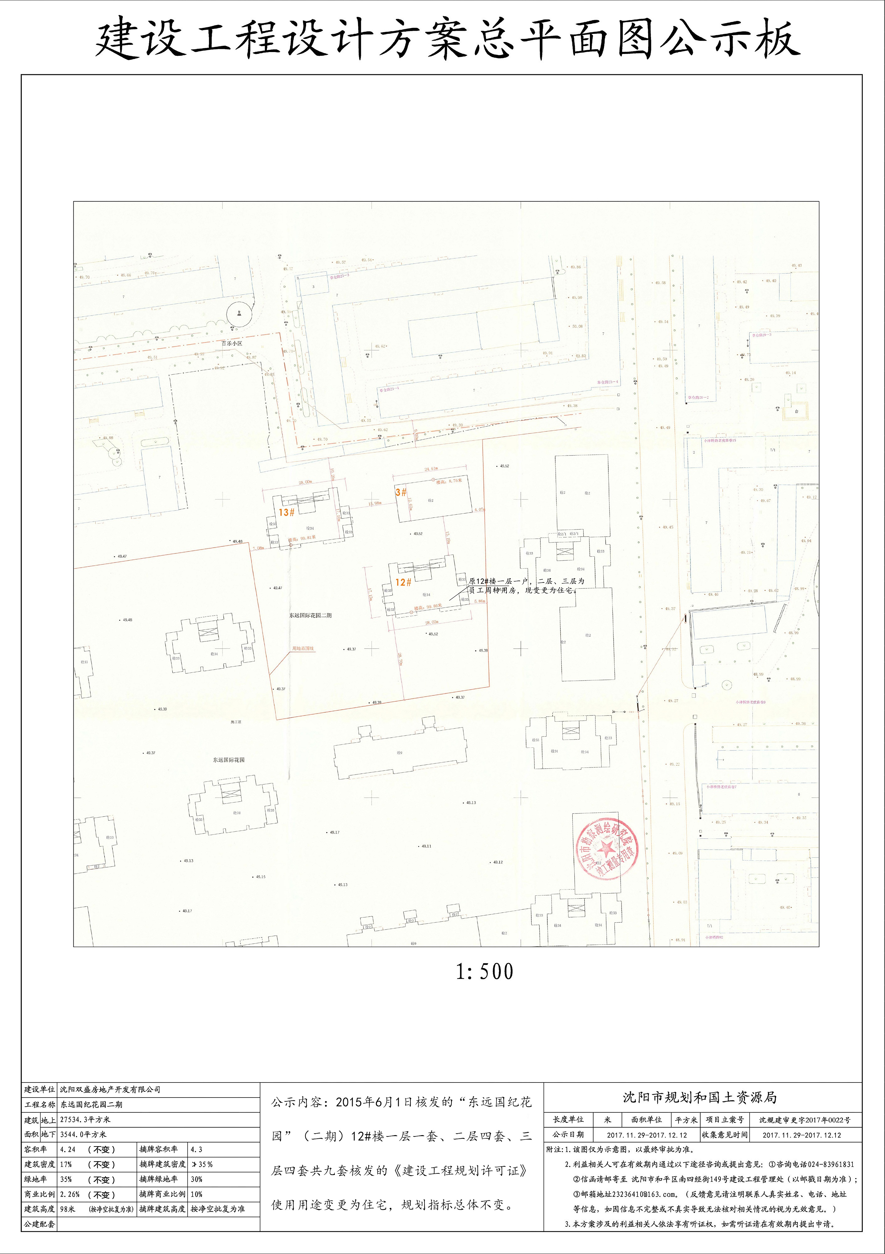 沈阳双盛房地产开发有限公司东远国纪花园二期工程12#楼1层局部、2层、3层使用性质变更方案批前公示