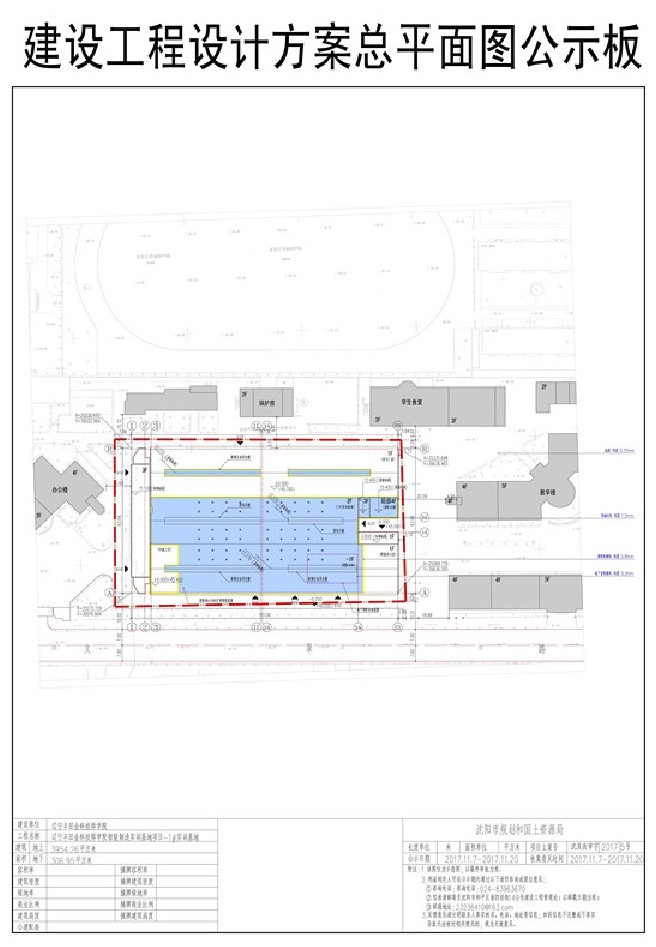 经沈阳市规划和国土资源局建设工程管理处审核,拟批准辽宁丰田金杯技师学院位于辽宁省沈阳市文萃路124号的辽宁丰田金杯技师学院智能制造实训基地项目-1#实训基地(项目)总平面规划方案,现对该项目总平面规划方案进行公示。