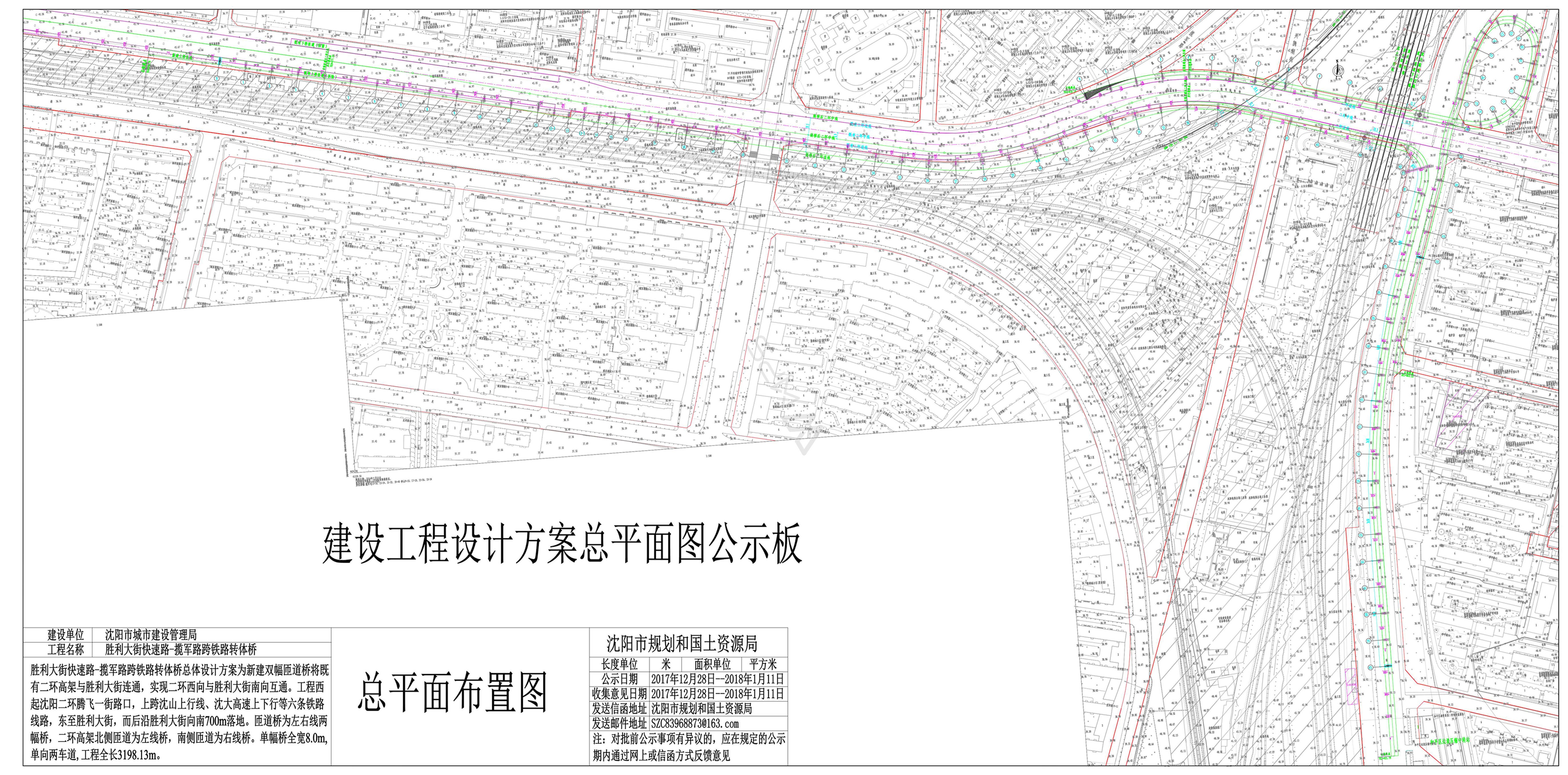 经沈阳市规划和国土资源局市政规划管理处审核,拟批准沈阳市城市建设管理局的胜利大街快速路-揽军路跨铁路转体桥工程,现对该项目总平面方案进行公示并征求意见。