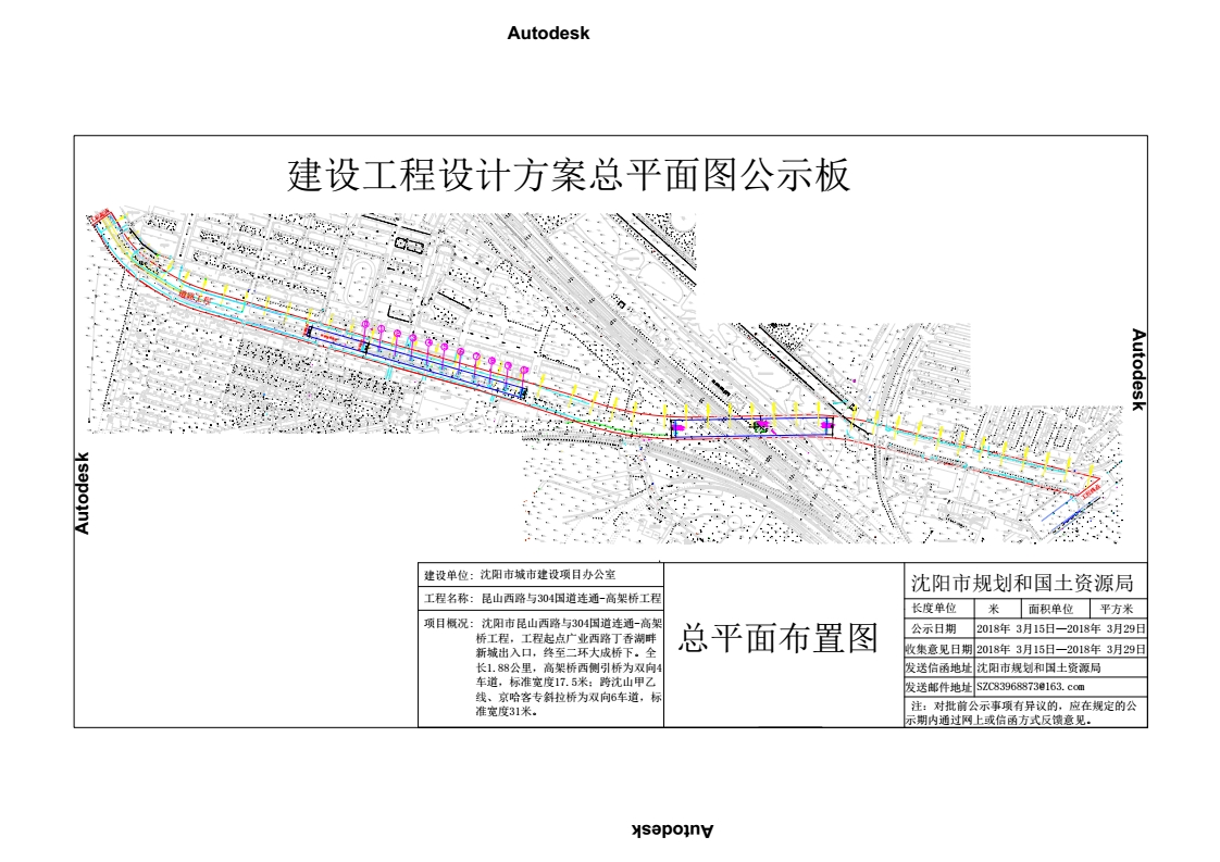 经沈阳市规划和国土资源局市政规划管理处审核,拟批准沈阳市城市建设项目办公室的昆山西路与304国道连通高架桥工程,现对该项目总平面方案进行公示并征求意见。