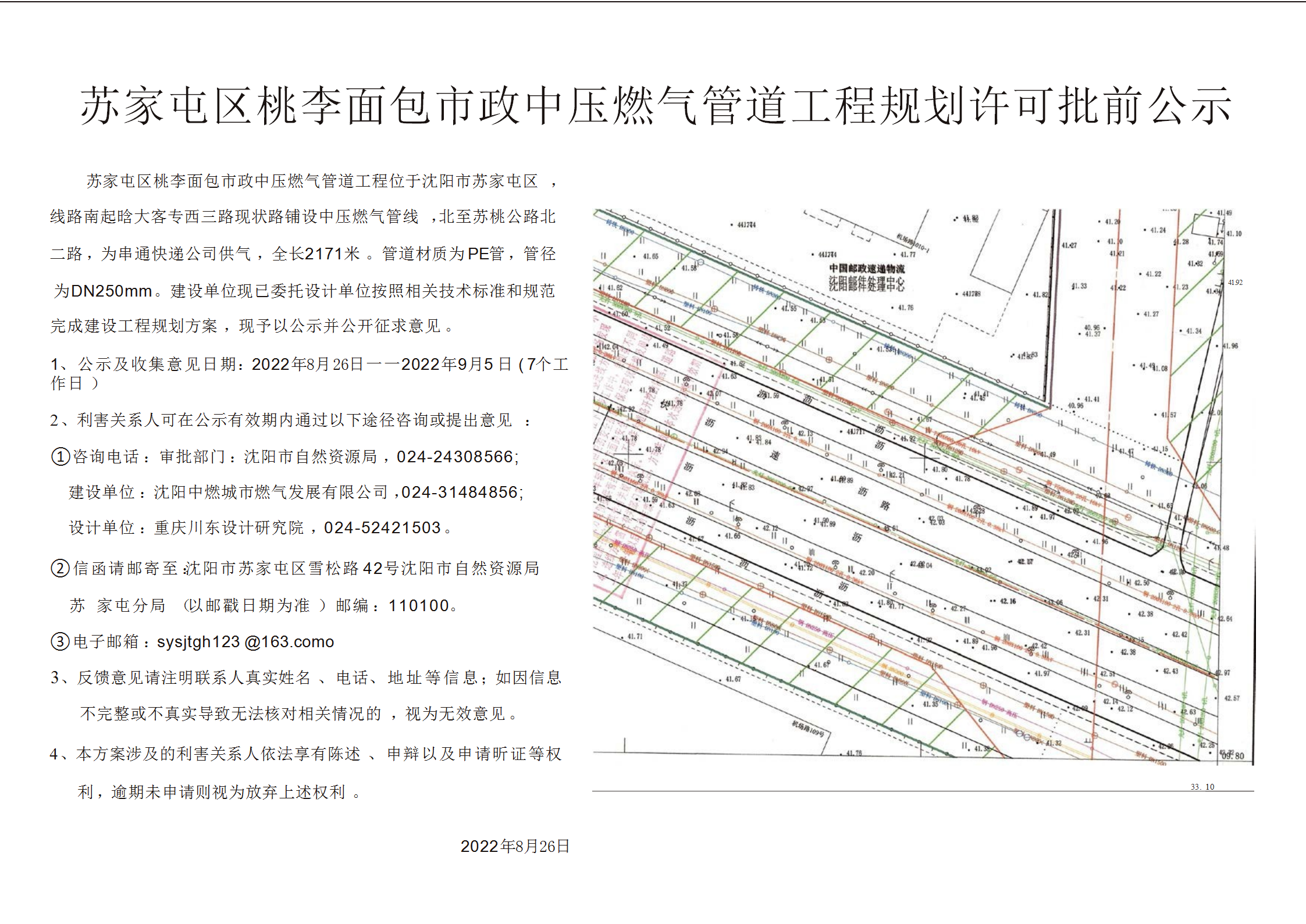 苏家屯区桃李面包市政中压燃气管道工程规划许可批前公示