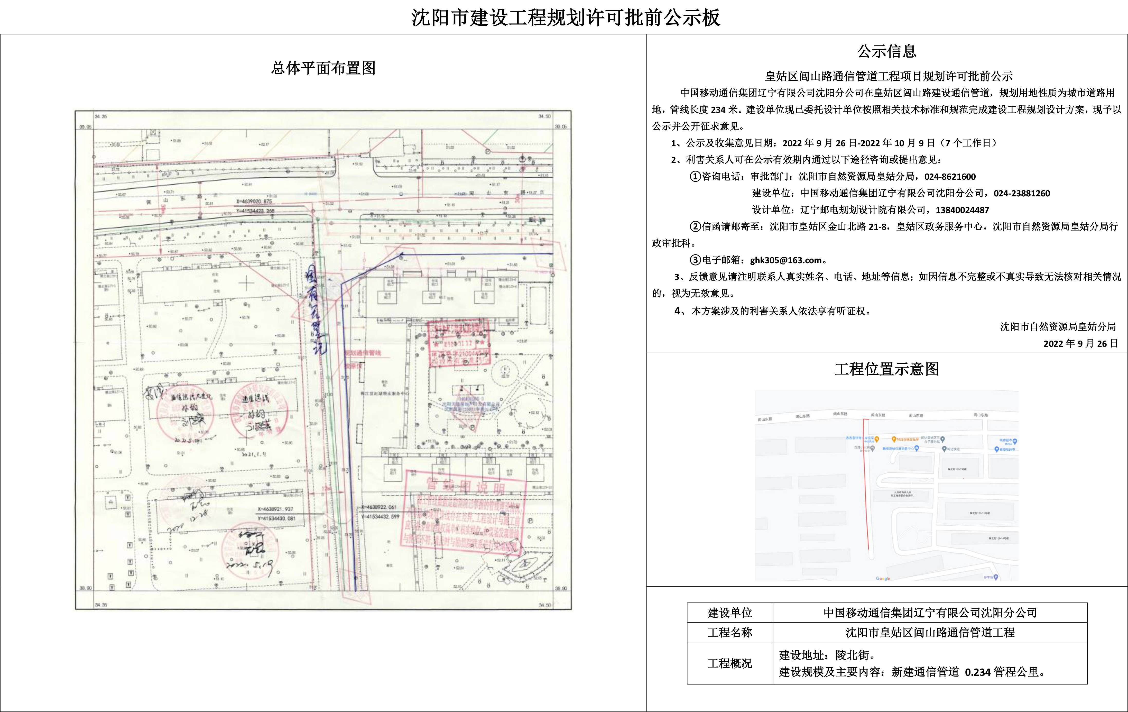 中国移动通信集团辽宁有限公司沈阳分公司在皇姑区闾山路建设通信管道,规划用地性质为城市道路用地,管线长度234米。建设单位现已委托设计单位按照相关技术标准和规范完成建设工程规划设计方案,现予以公示并公开征求意见。 1、公示及收集意见日期:2022年9月26日-2022年10月9日(7个工作日) 2、利害关系人可在公示有效期内通过以下途径咨询或提出意见: ①咨询电话:审批部门:沈阳市自然资源局皇姑分局,024-8621600 建设单位:中国移动通信集团辽宁有限公司沈阳分公司,024-23881260 设计单位:辽宁邮电规划设计院有限公司,13840024487 ②信函请邮寄至:沈阳市皇姑区金山北路21-8,皇姑区政务服务中心,沈阳市自然资源局皇姑分局行政审批科。 ③电子邮箱:ghk305@163.com。 3、反馈意见请注明联系人真实姓名、电话、地址等信息;如因信息不完整或不真实导致无法核对相关情况的,视为无效意见。 4、本方案涉及的利害关系人依法享有听证权。 沈阳市自然资源局皇姑分局 2022年9月26日