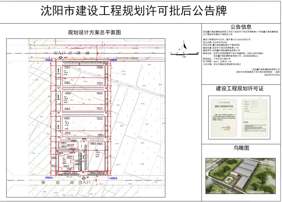 沈阳鑫天润机械制造有限公司位于沈阳市于洪区洪泽路南1-7号的鑫天润机械制造生产基地项目建设工程批后公告
