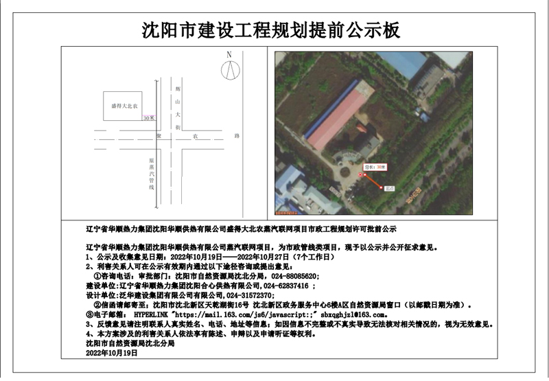 辽宁省华顺热力集团辉山大街(大北农项目)蒸汽管线工程市政工程批前公示 辽宁省华顺热力集团沈阳华顺供热有限公司蒸汽联网项目,为市政管线类项目,现予以公示并公开征求意见。 1、公示及收集意见日期:2022年10月19日——2022年10月27日(7个工作日) 2、利害关系人可在公示有效期内通过以下途径咨询或提出意见: ①咨询电话:审批部门:沈阳市自然资源局沈北分局,024-88085620; 建设单位:辽宁省华顺热力集团沈阳合心供热有限公司,024-62837416 ; 设计单位:泛华建设集团有限公司有限公司,024-31572370; ②信函请邮寄至;沈阳市沈北新区天乾湖街16号 沈北新区政务服务中心6楼A区自然资源局窗口(以邮戳日期为准)。 ③电子邮箱:sbxqghjzl@163.com。 3、反馈意见请注明联系人真实姓名、电话、地址等信息;如因信息不完整或不真实导致无法核对相关情况的,视为无效意见。 4、本方案涉及的利害关系人依法享有陈述、申辩以及申请听证等权利。 沈阳市自然资源局沈北分局 2022年10月19日