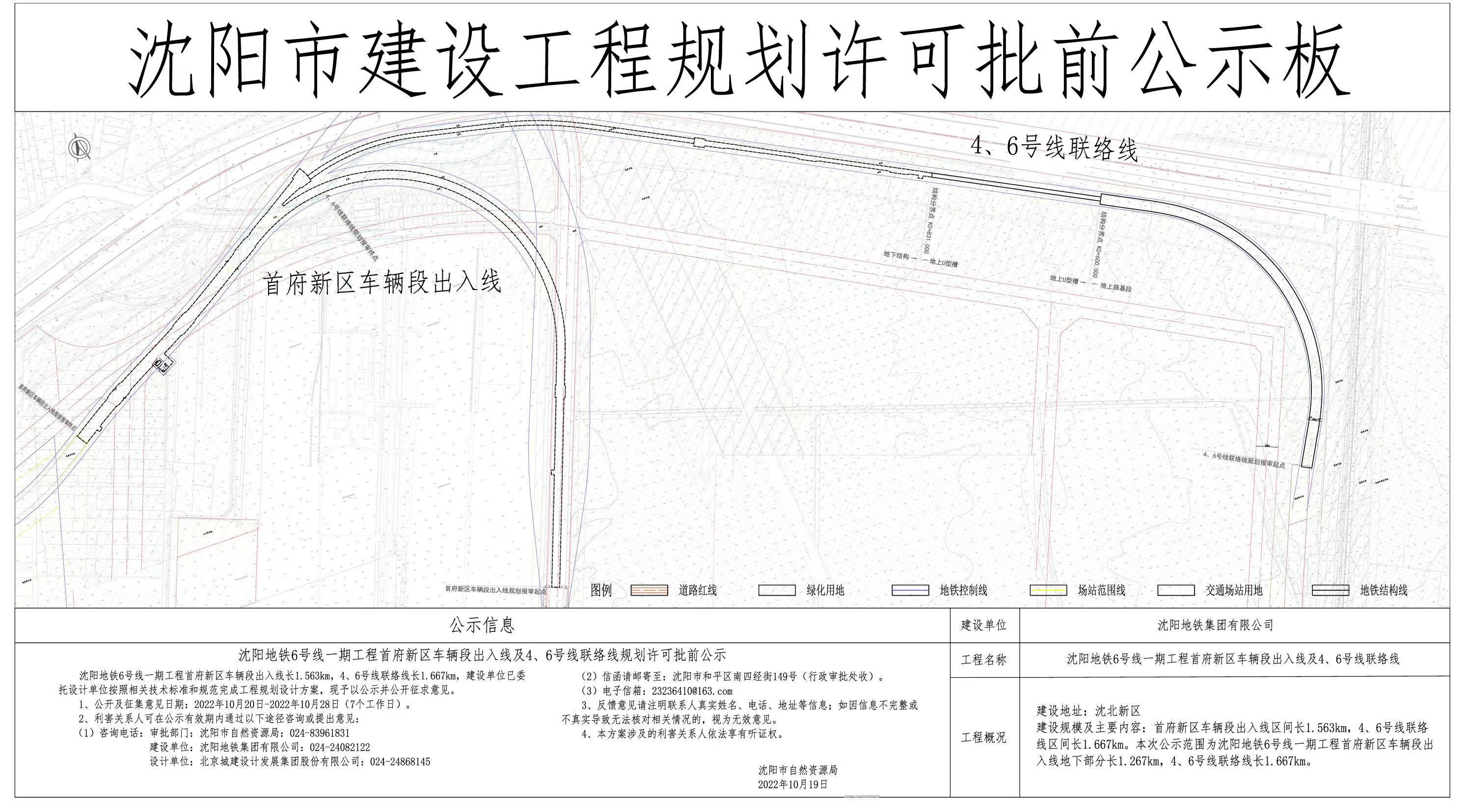 沈阳地铁6号线一期工程首府新区车辆段出入线长1.563km,4、6号线联络线长1.667km,建设单位已委托设计单位按照相关技术标准和规范完成工程规划设计方案,现予以公示并公开征求意见。 1、公开及征集意见日期:2022年10月20日-2022年10月28日(7个工作日)。 2、利害关系人可在公示有效期内通过以下途径咨询或提出意见: (1)咨询电话:审批部门:沈阳市自然资源局:024-83961831 建设单位:沈阳地铁集团有限公司:024-24082122 设计单位:北京城建设计发展集团股份有限公司:024-24868145 (2)信函请邮寄至:沈阳市和平区南四经街149号(行政审批处收)。 (3)电子信箱:23236410@163.com 3、反馈意见请注明联系人真实姓名、电话、地址等信息;如因信息不完整或不真实导致无法核对相关情况的,视为无效意见。 4、本方案涉及的利害关系人依法享有听证权。 沈阳市自然资源局 2022年10月19日