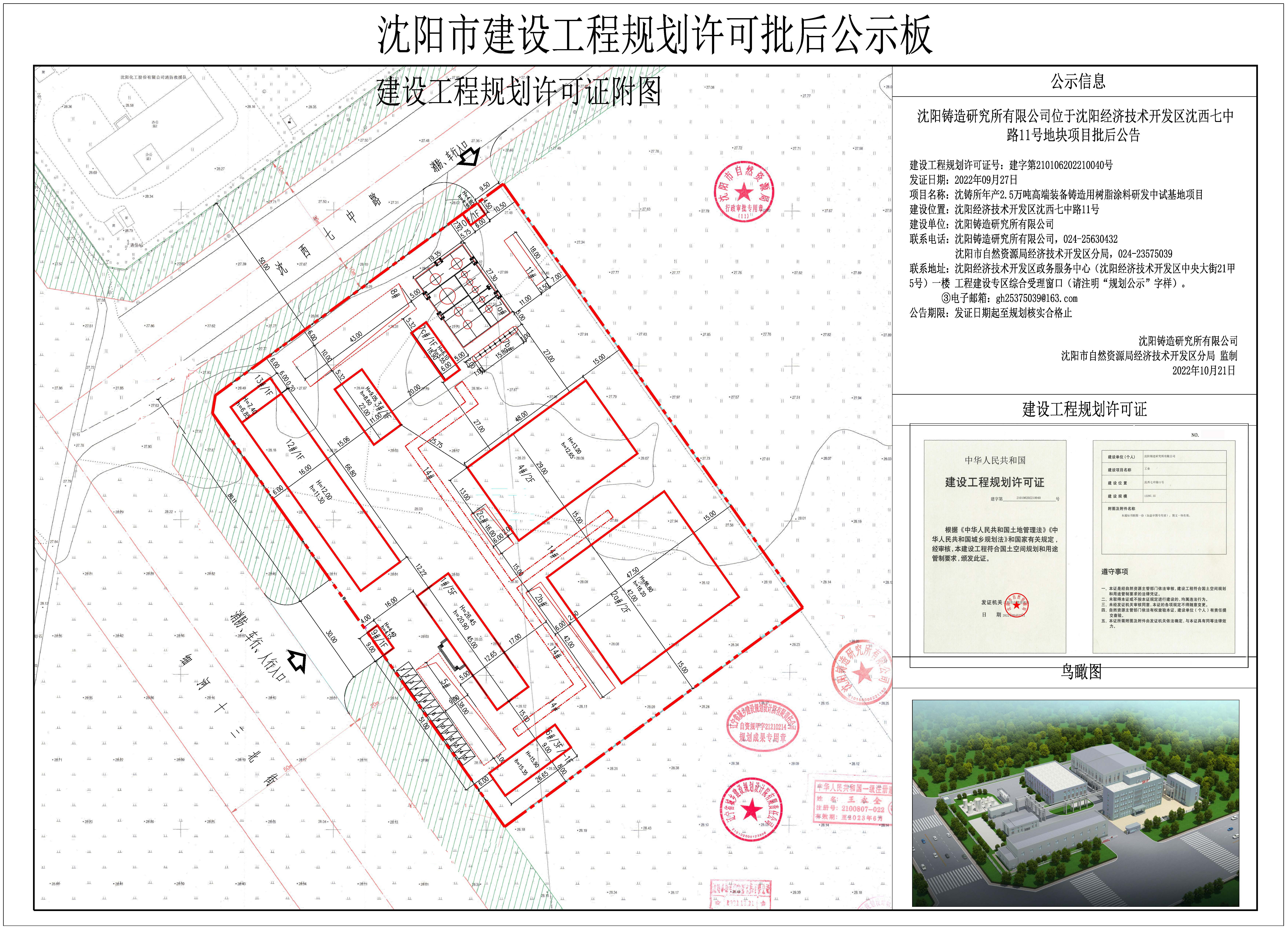 建设工程规划许可证号:建字第210106202210040号 发证日期:2022年09月27日 项目名称:沈铸所年产2.5万吨高端装备铸造用树脂涂料研发中试基地项目 建设位置:沈阳经济技术开发区沈西七中路11号 建设单位:沈阳铸造研究所有限公司 联系电话:沈阳铸造研究所有限公司,024-25630432 沈阳市自然资源局经济技术开发区分局,024-23575039 联系地址:沈阳经济技术开发区政务服务中心(沈阳经济技术开发区中央大街21甲5号)一楼 工程建设专区综合受理窗口(请注明“规划公示”字样)。 ③电子邮箱:gh25375039@163.com 公告期限:发证日期起至规划核实合格止