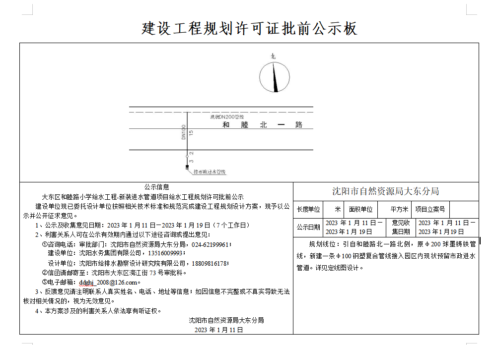 公示信息 大东区和睦路小学给水工程-新装进水管道项目给水工程规划许可批前公示 建设单位现已委托设计单位按照相关技术标准和规范完成建设工程规划设计方案,现予以公示并公开征求意见。 1、公示及收集意见日期:2023年1月11日—2023年1月19日(7个工作日) 2、利害关系人可在公示有效期内通过以下途径咨询或提出意见: ①咨询电话:审批部门:沈阳市自然资源局大东分局,024-62199961; 建设单位:沈阳水务集团有限公司,13516009993; 设计单位:沈阳市给排水勘察设计研究院有限公司,18809816178; ②信函请邮寄至:沈阳市大东区滂江街73号审批科。 ③电子邮箱:ddghj_2008@126.com。 3、反馈意见请注明联系人真实姓名、电话、地址等信息;如因信息不完整或不真实导致无法核对相关情况的,视为无效意见。 4、本方案涉及的利害关系人依法享有听证权。 沈阳市自然资源局大东分局 2023年1月11日