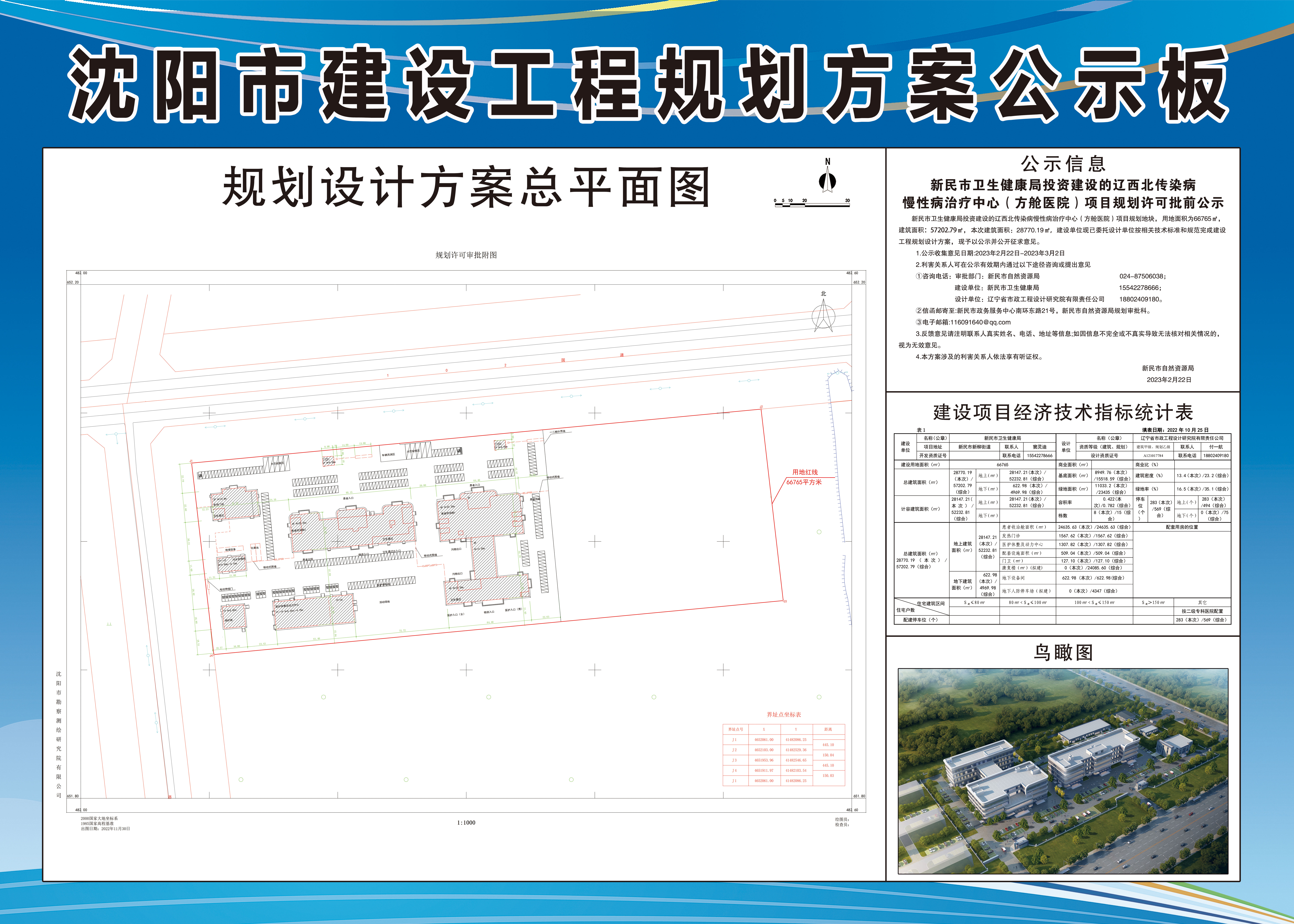 新民市卫生健康局投资建设的辽西北传染病慢性病治疗中心(方舱医院)项目规划地块,用地面积为66765㎡,建筑面积:57202.79㎡,本次建筑面积:28770.19㎡,建设单位现已委托设计单位按相关技术标准和规范完成建设工程规划设计方案,现予以公示并公开征求意见。 1.公示收集意见日期:2023年2月22日-2023年3月2日 2.利害关系人可在公示有效期内通过以下途径咨询或提出意见 ①咨询电话:审批部门:新民市自然资源局 024-87506038; 建设单位:新民市卫生健康局 15542278666; 设计单位:辽宁省市政工程设计研究院有限责任公司 18802409180。 ②信函邮寄至:新民市政务服务中心南环东路21号,新民市自然资源局规划审批科。 ③电子邮箱:116091640@qq.com 3.反馈意见请注明联系人真实姓名、电话、地址等信息;如因信息不完全或不真实导致无法核对相关情况的,视为无效意见。 4.本方案涉及的利害关系人依法享有听证权。