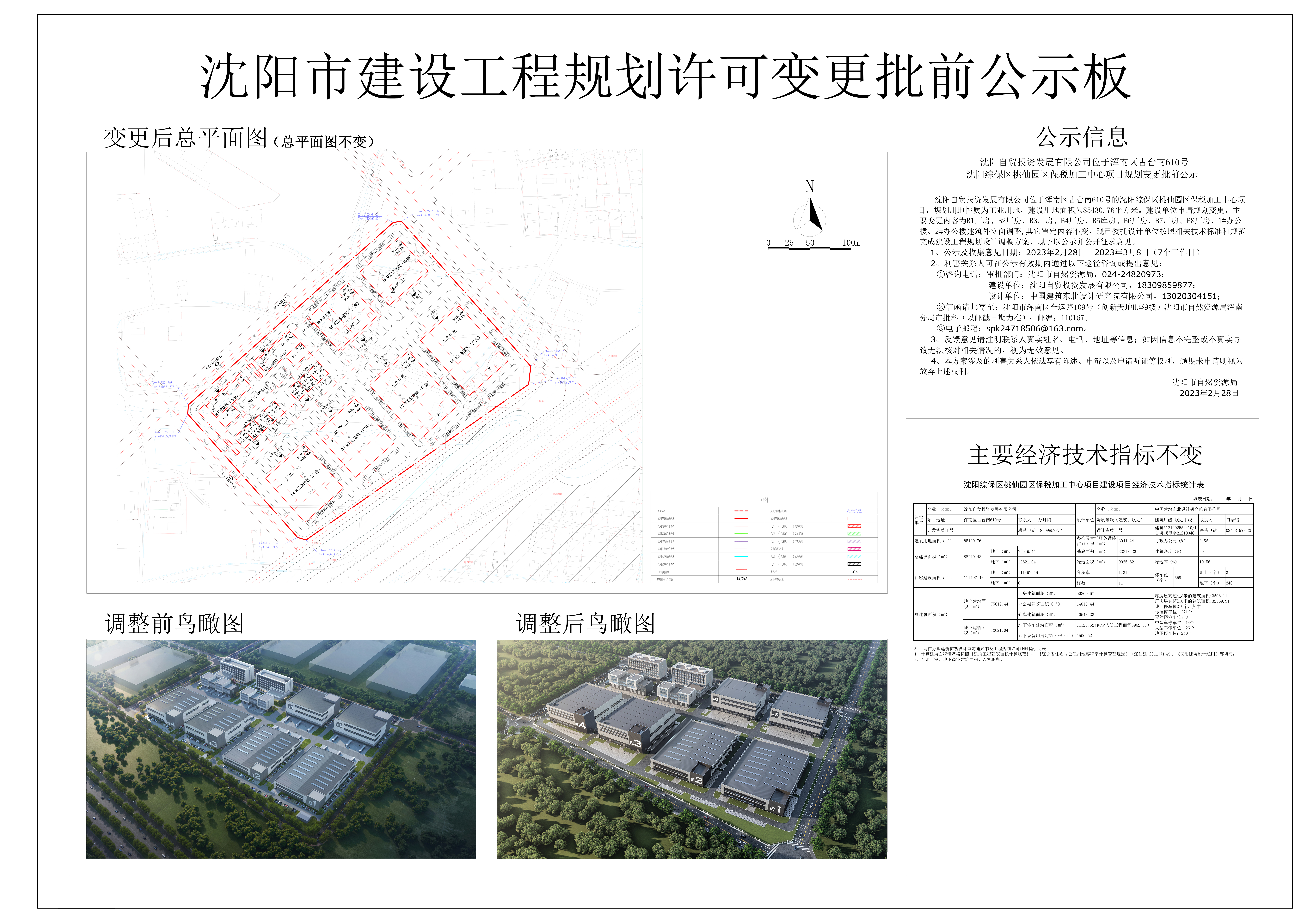 沈阳自贸投资发展有限公司位于浑南区古台南610号的沈阳综保区桃仙园区保税加工中心项目,规划用地性质为工业用地,建设用地面积为85430.76平方米。建设单位申请规划变更,主要变更内容为B1厂房、B2厂房、B3厂房、B4厂房、B5库房、B6厂房、B7厂房、B8厂房、1#办公楼、2#办公楼建筑外立面调整,其他审定内容不变。现已委托设计单位按照相关技术标准和规范完成建设工程规划设计调整方案,现予以公示并公开征求意见。 1、公示及收集意见日期:2023年2月28日--2023年3月8日(7个工作日) 2、利害关系人可在公示有效期内通过以下途径咨询或提出意见: ①咨询电话:审批部门:沈阳市自然资源局,024-24820973; 建设单位:沈阳自贸投资发展有限公司,18309859877; 设计单位:中国建筑东北设计研究院有限公司,13020304151; ②信函请邮寄至;沈阳市浑南区全运路109号(创新天地H座9楼)沈阳市自然资源局浑南分局审批科(以邮戳日期为准);邮编:110167。 ③电子邮箱:spk24718506@163.com。 3、反馈意见请注明联系人真实姓名、电话、地址等信息;如因信息不完整或不真实导致无法核对相关情况的,视为无效意见。 4、本方案涉及的利害关系人依法享有陈述、申辩以及申请听证等权利,逾期未申请则视为放弃上述权利。 沈阳市自然资源局 2023年2月28日