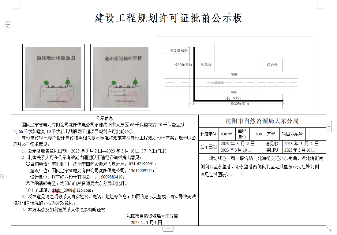 公示信息 国网辽宁省电力有限公司沈阳供电公司承建沈阳市大东区66千伏望花变10千伏壹品线 与66千伏如意变10千伏新出线联网工程项目规划许可批前公示 建设单位现已委托设计单位按照相关技术标准和规范完成建设工程规划设计方案,现予以公示并公开征求意见。 1、公示及收集意见日期:2023年3月2日—2023年3月10日(7个工作日) 2、利害关系人可在公示有效期内通过以下途径咨询或提出意见: ①咨询电话:审批部门:沈阳市自然资源局大东分局,024-62199961; 建设单位:国网辽宁省电力有限公司沈阳供电公司,13614009111; 设计单位:辽宁屹立设计有限公司,15009883410; ②信函请邮寄至:沈阳市自然资源局大东分局审批科。 ③电子邮箱:ddghj_2008@126.com。 3、反馈意见请注明联系人真实姓名、电话、地址等信息;如因信息不完整或不真实导致无法核对相关情况的,视为无效意见。 4、本方案涉及的利害关系人依法享有听证权。 沈阳市自然资源局大东分局 2023年3月1日