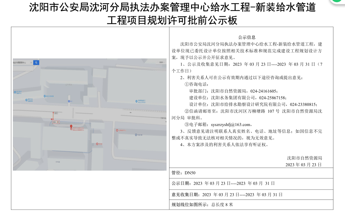 沈阳市公安局沈河分局执法办案管理中心给水工程-新装给水管道工程,建设单位现已委托设计单位按照相关技术标准和规范完成建设工程规划设计方案,现予以公示并公开征求意见。 1、公示及收集意见日期:2023 年03月23日----2023 年03月31日(7 个工作日) 2、利害关系人可在公示有效期内通过以下途径咨询或提出意见: ①咨询电话: 审批部门:沈阳市自然资源局,024-24161605; 建设单位:沈阳水务集团有限公司,024-25867158; 设计单位:沈阳市给排水勘察设计研究院有限公司,024-23380815; ②信函请邮寄至:沈阳市沈河区万柳塘路 107号 沈阳市自然资源局沈河分局 审批科。 ③电子邮箱:syszrzyshfj@163.com。 3、反馈意见请注明联系人真实姓名、电话、地址等信息;如因信息不完整或不真实导致无法核对相关情况的,视为无效意见。 4、本方案涉及的利害关系人依法享有听证权。