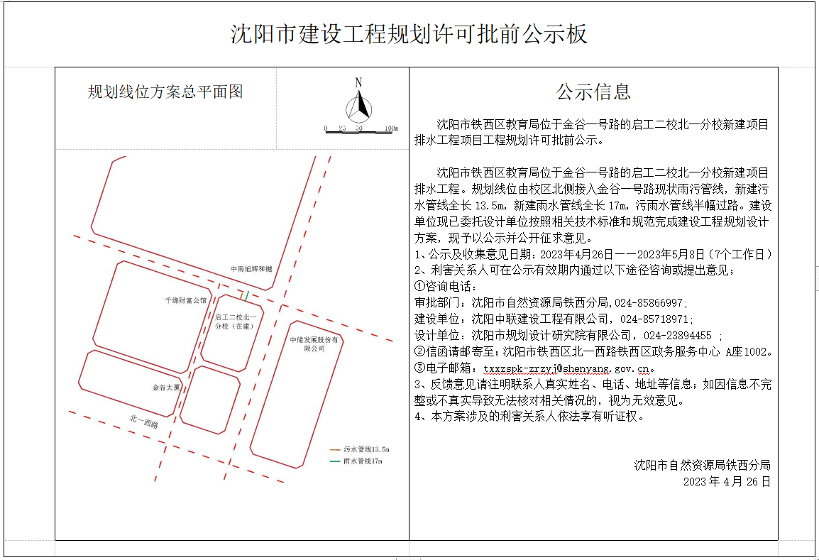 沈阳市铁西区教育局位于金谷一号路的启工二校北一分校新建项目排水工程。规划线位由校区北侧接入金谷一号路现状雨污管线,新建污水管线全长13.5m,新建雨水管线全长17m,污雨水管线半幅过路。建设单位现已委托设计单位按照相关技术标准和规范完成建设工程规划设计方案,现予以公示并公开征求意见。 1、公示及收集意见日期:2023年4月26日——2023年5月8日(7个工作日) 2、利害关系人可在公示有效期内通过以下途径咨询或提出意见; ①咨询电话:审批部门:沈阳市自然资源局铁西分局,024-85866997; 建设单位:沈阳中联建设工程有限公司,024-85718971; 设计单位:沈阳市规划设计研究院有限公司,024-23894455 ; ②信函请邮寄至;沈阳市铁西区北一西路铁西区政务服务中心 A座1002。 ③电子邮箱:txxzspk-zrzyj@shenyang.gov.cn。 3、反馈意见请注明联系人真实姓名、电话、地址等信息;如因信息不完整或不真实导致无法核对相关情况的,视为无效意见。 4、本方案涉及的利害关系人依法享有听证权。