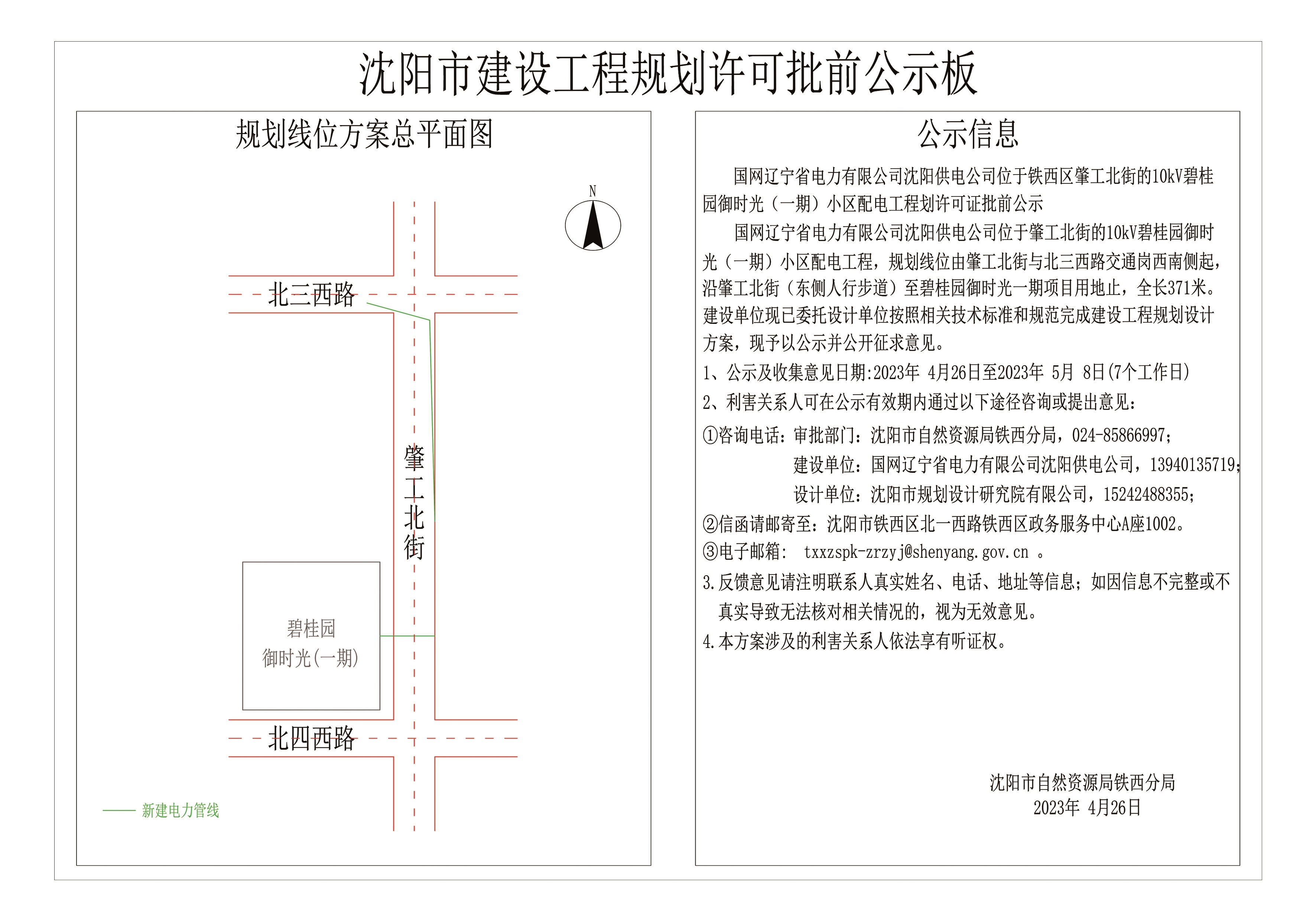 国网辽宁省电力有限公司沈阳供电公司位于肇工北街的10kV碧桂园御时光(一期)小区配电工程,规划线位由肇工北街与北三西路交通岗西南侧起,沿肇工北街(东侧人行步道)至碧桂园御时光一期项目用地止,全长371米。建设单位现已委托设计单位按照相关技术标准和规范完成建设工程规划设计方案,现予以公示并公开征求意见。 1、公示及收集意见日期:2023年4月26日至2023年5月8日(7个工作日) 2、利害关系人可在公示有效期内通过以下途径咨询或提出意见: ①咨询电话:审批部门:沈阳市自然资源局铁西分局,024-85866997; 建设单位:国网辽宁省电力有限公司沈阳供电公司,13940135719; 设计单位:沈阳市规划设计研究院有限公司,15242488355; ②信函请邮寄至:沈阳市铁西区北一西路铁西区政务服务中心A座1002。 ③电子邮箱: txxzspk-zrzyj@shenyang.gov.cn 。 3、反馈意见请注明联系人真实姓名、电话、地址等信息;如因信息不完整或不真实导致无法核对相关情况的,视为无效意见。 4、本方案涉及的利害关系人依法享有听证权。