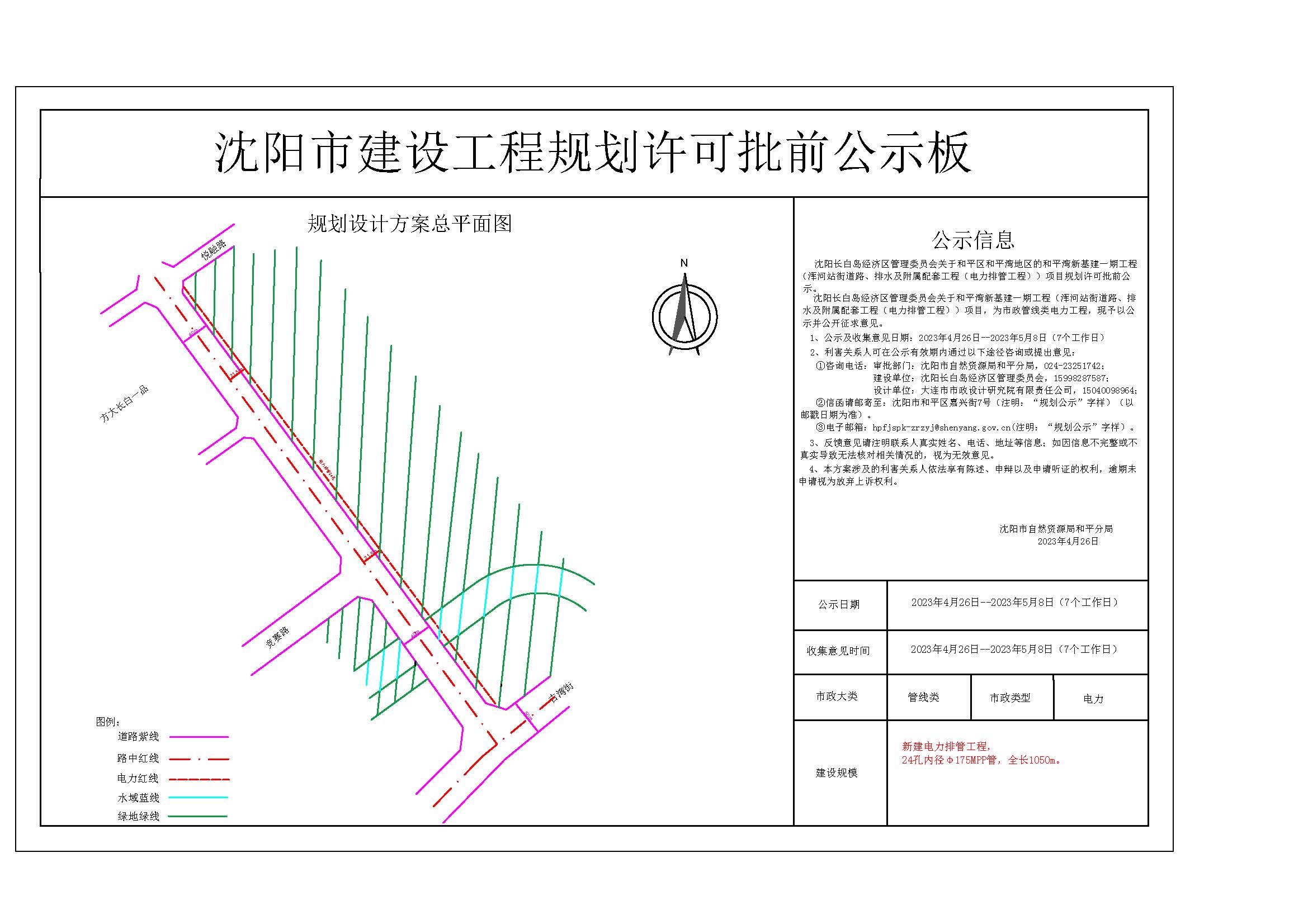 公示信息 沈阳长白岛经济区管理委员会关于和平区和平湾地区的和平湾新基建一期工程(浑河站街道路、排水及附属配套工程(电力排管工程))项目规划许可批前公示。 沈阳长白岛经济区管理委员会关于和平湾新基建一期工程(浑河站街道路、排水及附属配套工程(电力排管工程))项目,为市政管线类电力工程,现予以公示并公开征求意见。 1、公示及收集意见日期:2023年4月26日--2023年5月8日(7个工作日) 2、利害关系人可在公示有效期内通过以下途径咨询或提出意见: ①咨询电话:审批部门:沈阳市自然资源局和平分局,024-23251742; 建设单位:沈阳长白岛经济区管理委员会,15998287587; 设计单位:大连市市政设计研究院有限责任公司,15040098964; ②信函请邮寄至:沈阳市和平区嘉兴街7号(注明:“规划公示”字样)(以邮戳日期为准)。 ③电子邮箱:hpfjspk-zrzyj@shenyang.gov.cn(注明:“规划公示”字样)。 3、反馈意见请注明联系人真实姓名、电话、地址等信息;如因信息不完整或不真实导致无法核对相关情况的,视为无效意见。 4、本方案涉及的利害关系人依法享有陈述、申辩以及申请听证的权利,逾期未申请视为放弃上诉权利。