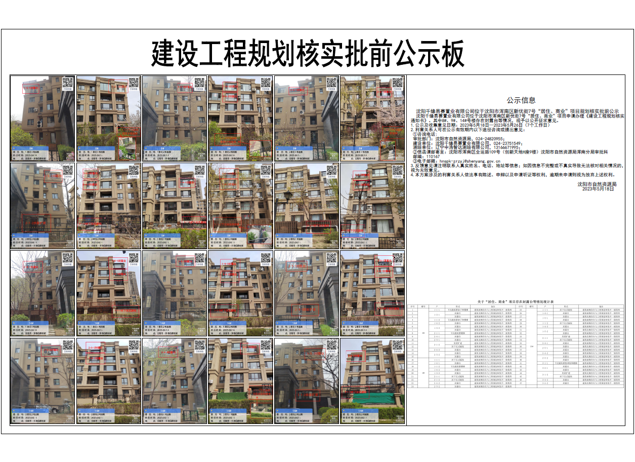 沈阳千缘易赛置业有限公司位于沈阳市浑南区新优街7号“居住、商业”项目申请办理《建设工程规划核实通知书》。其中8#、9#、14#号楼存在封露台等情况,现予以公开征求意见。 1.公示及收集意见日期:2023年5月18日--2023年5月26日(7个工作日) 2.利害关系人可在公示有效期内以下途径咨询或提出意见: ①咨询电话: 审批部门:沈阳市自然资源局,024-24820955; 建设单位:沈阳千缘易赛置业有限公司,024- 23751549; 测绘单位:辽宁中浩智达测绘有限公司,13166671995; ②信函请邮寄至:沈阳市浑南区全运路109号(创新天地H座9楼)沈阳市自然资源局浑南分局审批科 邮编:110167 ③电子邮箱:hnspk-zrzyj@shenyang.gov.cn