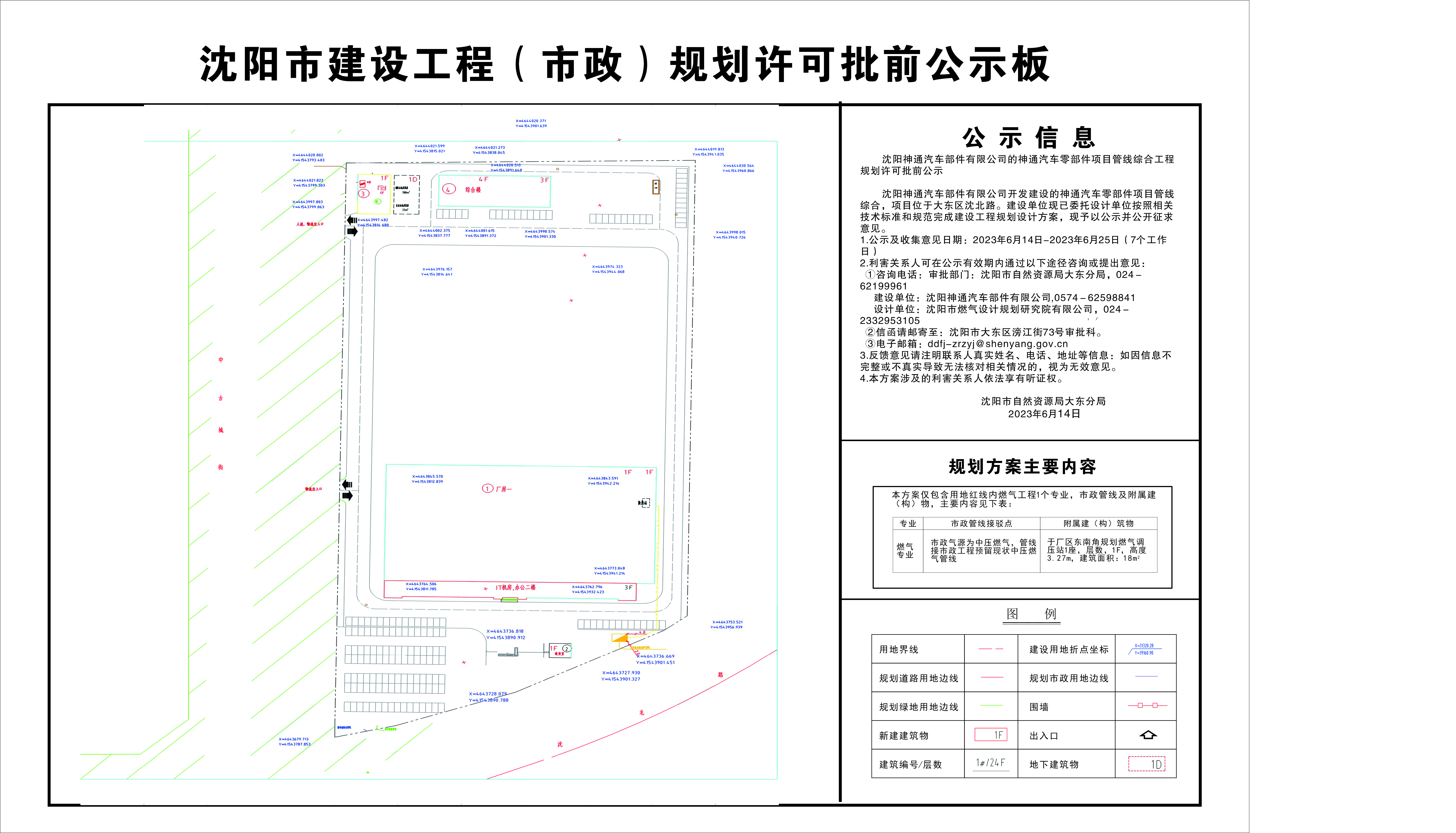 公示信息 沈阳神通汽车部件有限公司的神通汽车零部件项目管线综合工程规划许可批前公示 沈阳神通汽车部件有限公司开发建设的神通汽车零部件项目管线综合,项目位于大东区沈北路。建设单位现已委托设计单位按照相关技术标准和规范完成建设工程规划设计方案,现予以公示并公开征求意见。 1.公示及收集意见日期:2023年6月14日-2023年6月25日(7个工作日) 2.利害关系人可在公示有效期内通过以下途径咨询或提出意见: ①咨询电话:审批部门:沈阳市自然资源局大东分局,024-62199961 建设单位:沈阳神通汽车部件有限公司,0574-62598841 设计单位:沈阳市燃气设计规划研究院有限公司,024-2332953105 ②信函请邮寄至:沈阳市大东区滂江街73号审批科。 ③电子邮箱:ddfj-zrzyj@shenyang.gov.cn 3.反馈意见请注明联系人真实姓名、电话、地址等信息:如因信息不完整或不真实导致无法核对相关情况的,视为无效意见。 4.本方案涉及的利害关系人依法享有听证权。 沈阳市自然资源局大东分局 2023年6月14日