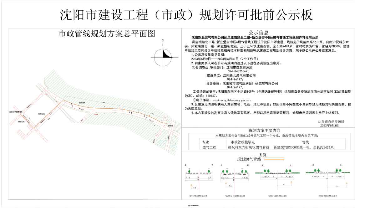 沈阳新北燃气有限公司的风能南路北二路-新立堡街中压A燃气管线工程规划许可批前公示 风能南路北二路-新立堡街中压A燃气管线工程位于沈阳市浑南区,线路起于风能南路北二路,向南沿祝科东六街、风能南路北一路、新立堡街敷设,止于三环快速路西侧,全长约2424米,管材材质为PE管,管径为DN300。建设单位现已委托设计单位按照相关技术标准和规范完成建设工程规划设计方案,现予以公示并公开征求意见。 1、公示及收集意见日期:2023年6月21日——2023年6月30日(7个工作日) 2、利害关系人可在公示有效期内通过以下途径咨询或提出意见: ①咨询电话:审批部门:沈阳市自然资源局,024-84821869; 建设单位:沈阳新北燃气有限公司,024-96177; 设计单位:沈阳城市燃气规划设计研究院有限公司, 024-96177。 ②信函请邮寄至:沈阳市浑南区全运路109号(创新天地H座9楼)沈阳市自然资源局浑南分局审批科(以邮戳日期为准) 邮编:110167。 ③电子邮箱:hnspk-zrzyj@shenyang.gov.cn。 3、反馈意见请注明联系人真实姓名、电话、地址等信息;如因信息不完整或不真实导致无法核对相关情况的,视为无效意见。 4、本方案涉及的利害关系人依法享有陈述、申辩以及申请听证等权利,逾期未申请则视为放弃上述权利。 沈阳市自然资源局 2023年6月21日